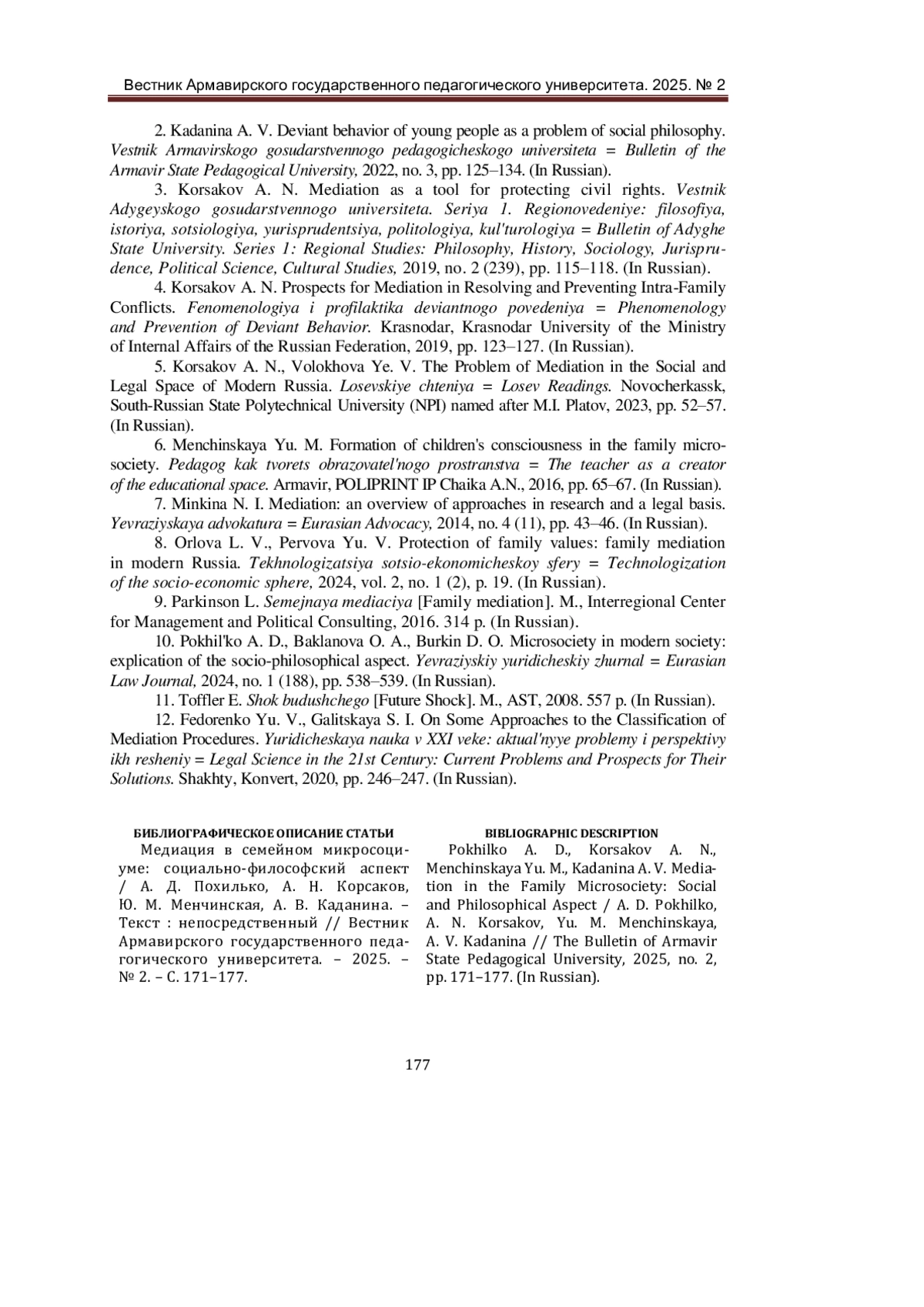 5. Корсаков, А. Н. Проблема медиации в социально-правовом пространстве современной России / А. Н. Корсаков, Е. В. Волохова. - Текст: непосредственный // Лосевские чтения: материалы XX Юбилейной международной научной конференции (г. Новочеркасск, 25-26 сентября 2023 года). - Новочеркасск: Южно-Российский государственный политехнический университет (НПИ) им. М.И. Платова, 2023. - С. 52-57. EDN: OHBQFP