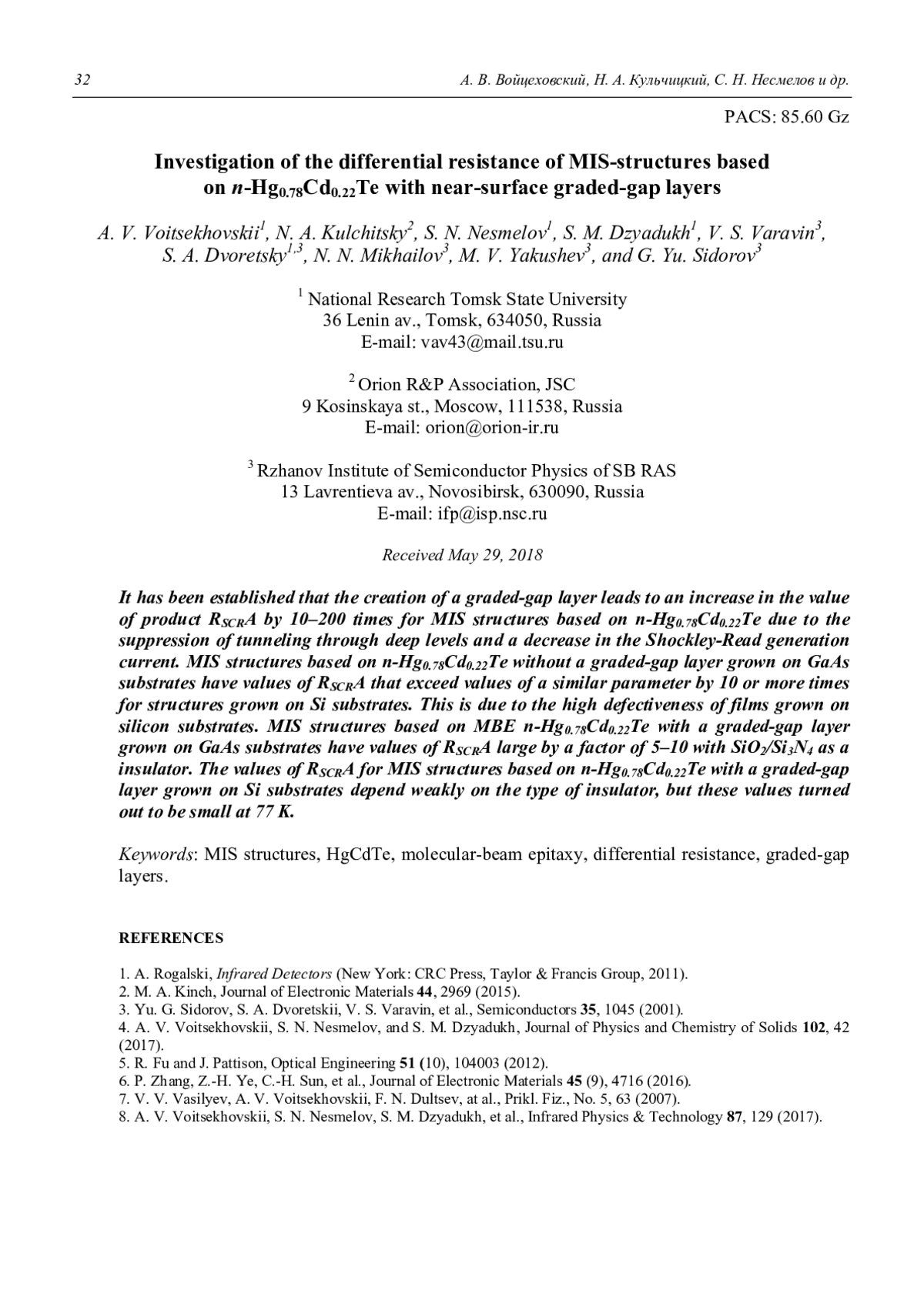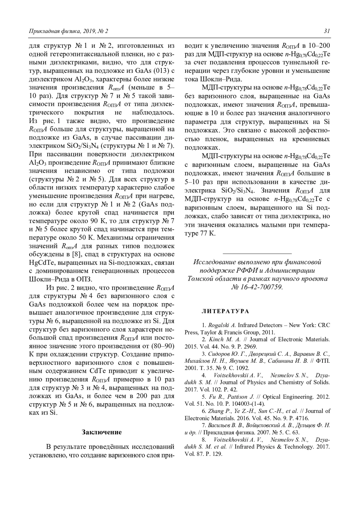 ВОЙЦЕХОВСКИЙ А. В., КУЛЬЧИЦКИЙ Н. А., НЕСМЕЛОВ С. Н., ДЗЯДУХ С. М., ВАРАВИН В. С., ДВОРЕЦКИЙ С., МИХАЙЛОВ Н., ЯКУШЕВ М. В., СИДОРОВ Г. Ю. ИССЛЕДОВАНИЕ ДИФФЕРЕНЦИАЛЬНОГО СОПРОТИВЛЕНИЯ МДП-СТРУКТУР НА ОСНОВЕ N-HG0,78CD0,22TE С ПРИПОВЕРХНОСТНЫМИ ВАРИЗОННЫМИ СЛОЯМИ // ПРИКЛАДНАЯ ФИЗИКА. 2019. №2