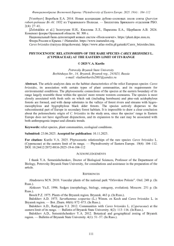 КУРИЛО В.А. ФИТОЦЕНОТИЧЕСКИЕ СВЯЗИ РЕДКОГО ВИДА CAREXBRIZOIDES L. (CYPERACEAE) У ВОСТОЧНОГО ПРЕДЕЛА АРЕАЛА // ФИТОРАЗНООБРАЗИЕ ВОСТОЧНОЙ ЕВРОПЫ. 2025. Т. 19 № 4