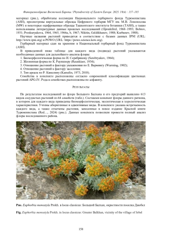 По результатам исследований во флоре Большого Балхана и его предгорий выявлено 613 видов сосудистых растений из 64 семейств (табл.). Составлен конспект флоры данного региона, в котором для каждого вида приведены биоморфологическая, экологическая и хорологическая характеристики. Учтены аборигенные и адвентивные виды. В конспекте указана встречаемость каждого вида, а также отмечены растения, занесенные в новое издание Красной книги Туркменистана (Red…, 2024) (рис.). Данные конспекта позволили провести полный анализ флоры исследованного района.