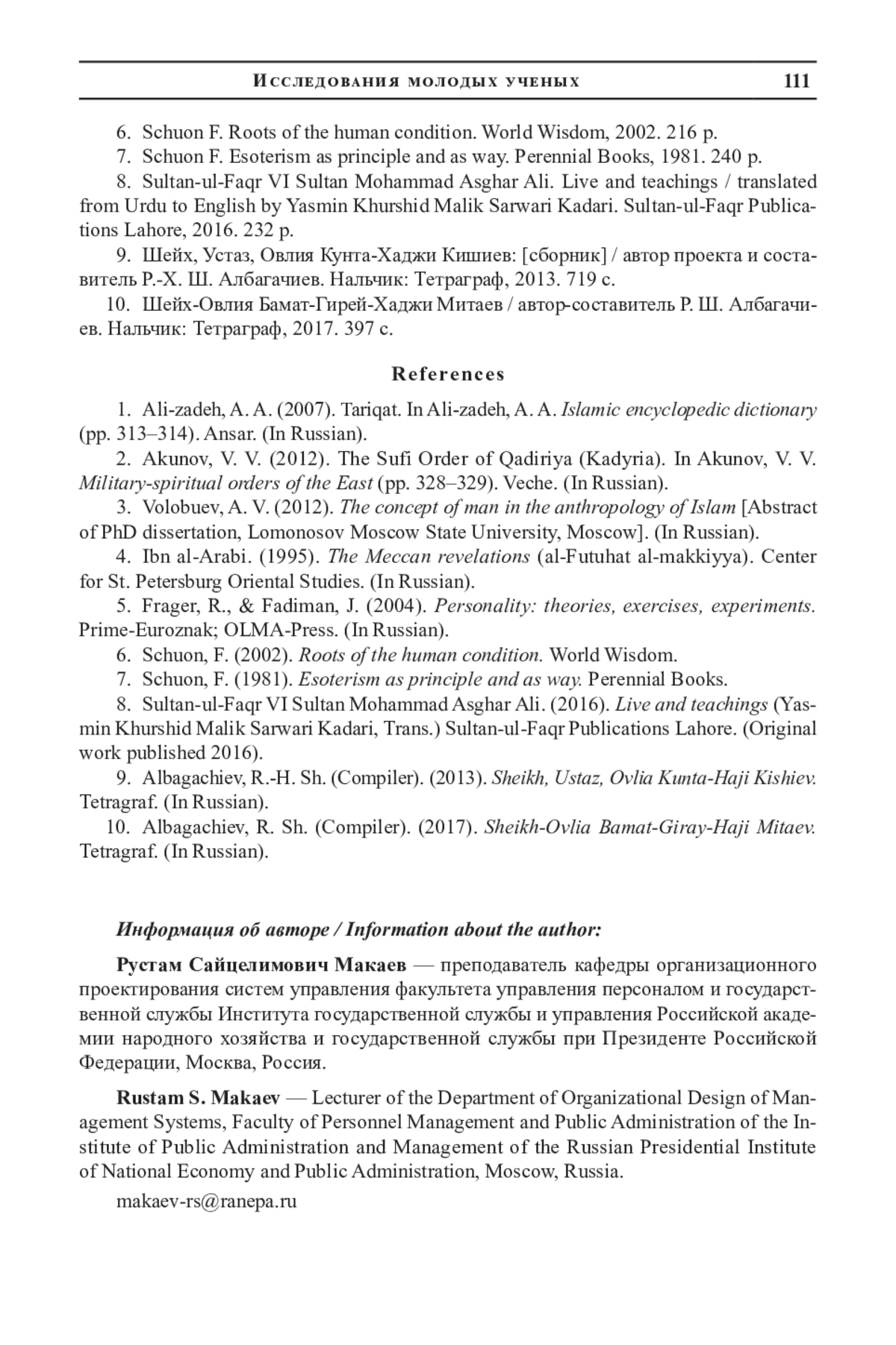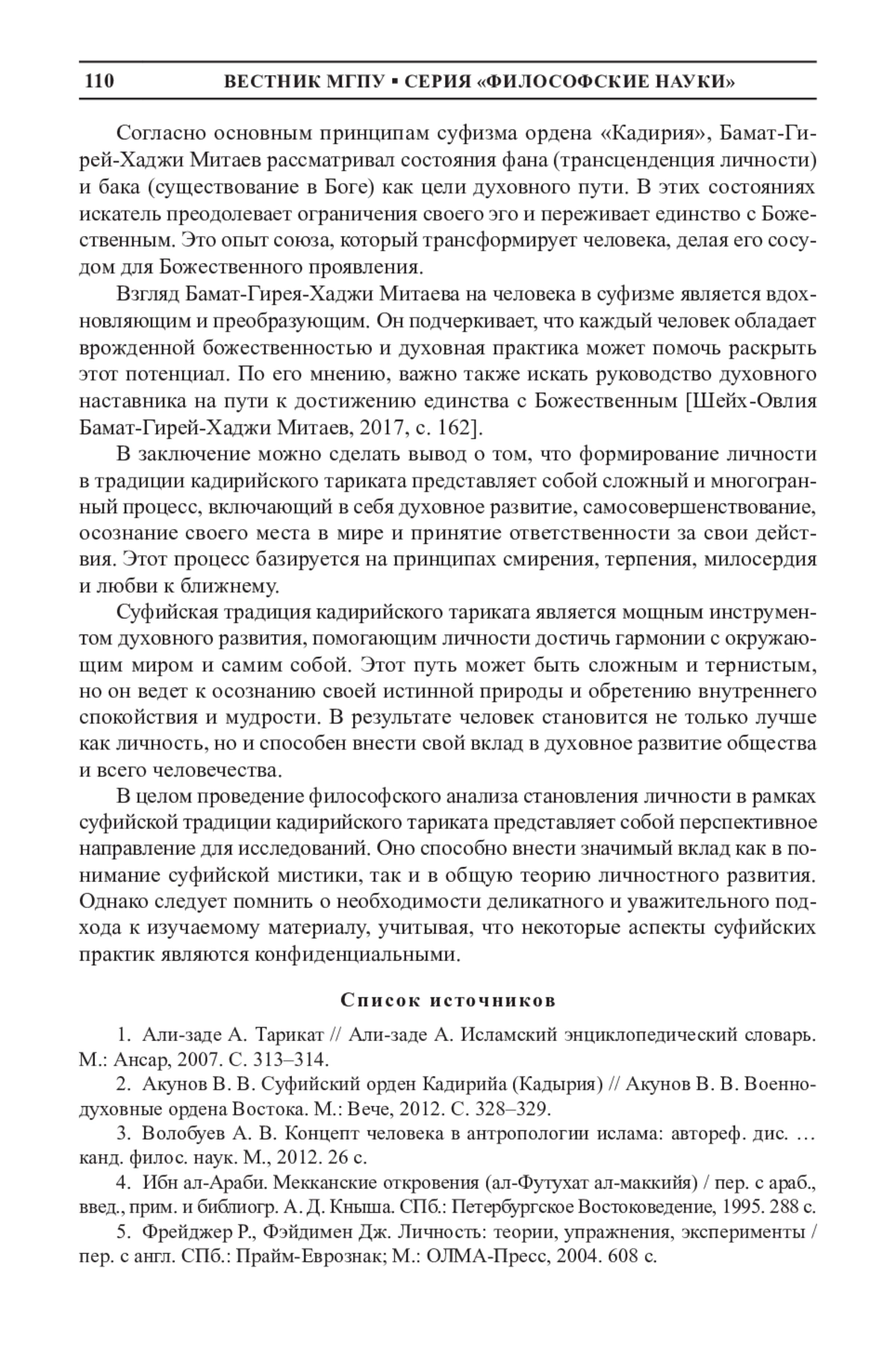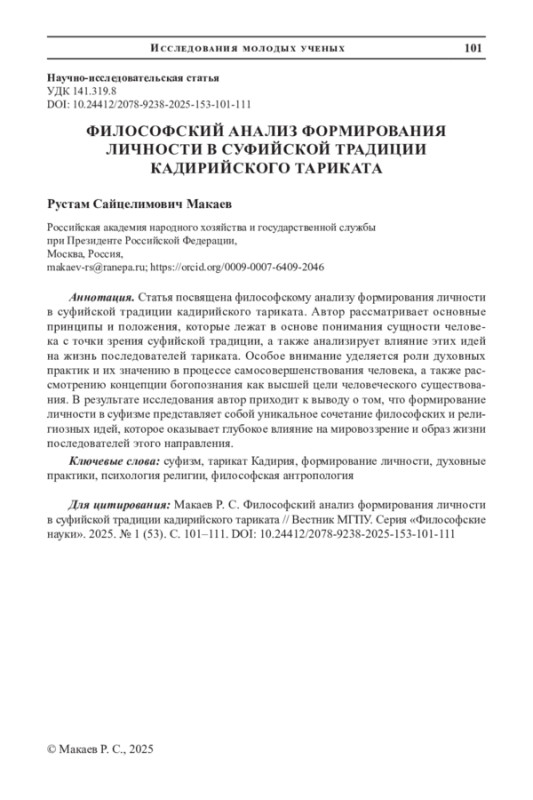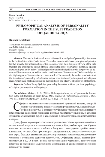 МАКАЕВ Р. С. ФИЛОСОФСКИЙ АНАЛИЗ ФОРМИРОВАНИЯ ЛИЧНОСТИ В СУФИЙСКОЙ ТРАДИЦИИ КАДИРИЙСКОГО ТАРИКАТА // ВЕСТНИК МГПУ. СЕРИЯ: ФИЛОСОФСКИЕ НАУКИ. 2025. № 1 (53)