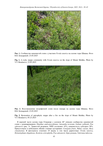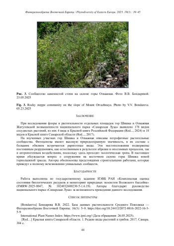 На территории национального парка «Самарская Лука» (Ставропольский район, Самарская область) проведены флористические исследования, в результате выявлено 178 видов сосудистых растений, из них 4 вида Красной книги Российской Федерации (Red…, 2024) и 18 видов Красной книги Самарской области (Red…, 2017). Выполнены геоботанические описания петрофитной растительности на склонах гор Шишка и Отважная. Дополнены база данных «Растительность Средней Волги» и Гербарий им. С. В. Саксонова (PVB) Института экологии Волжского бассейна РАН.