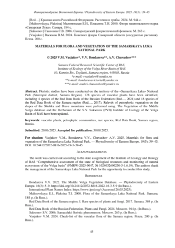 ВАСЮКОВ В. М., БОНДАРЕВА В. В., ЧУВАШОВ А. В. МАТЕРИАЛЫ К ФЛОРЕ И РАСТИТЕЛЬНОСТИ НАЦИОНАЛЬНОГО ПАРКА «САМАРСКАЯ ЛУКА» // ФИТОРАЗНООБРАЗИЕ ВОСТОЧНОЙ ЕВРОПЫ. 2025. Т. 19 № 3