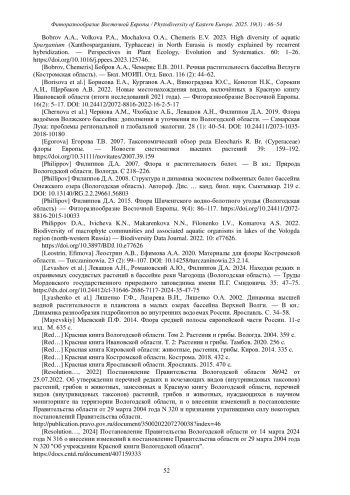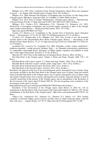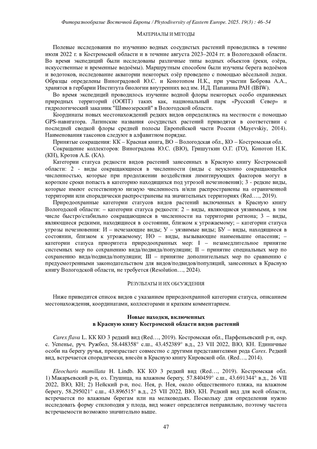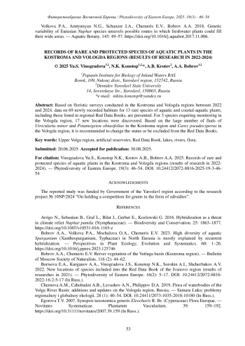 БОБРОВ А.А., КРОТОВ А.Б., ВИНОГРАДОВА Ю., КОНОТОП Н.К. НАХОДКИ РЕДКИХ И ОХРАНЯЕМЫХ ВИДОВ ВОДНЫХ РАСТЕНИЙ КОСТРОМСКОЙ И ВОЛОГОДСКОЙ ОБЛАСТЕЙ (ИТОГИ ИССЛЕДОВАНИЙ 2022-2024 ГГ.) // ФИТОРАЗНООБРАЗИЕ ВОСТОЧНОЙ ЕВРОПЫ. 2025. Т. 19 № 3