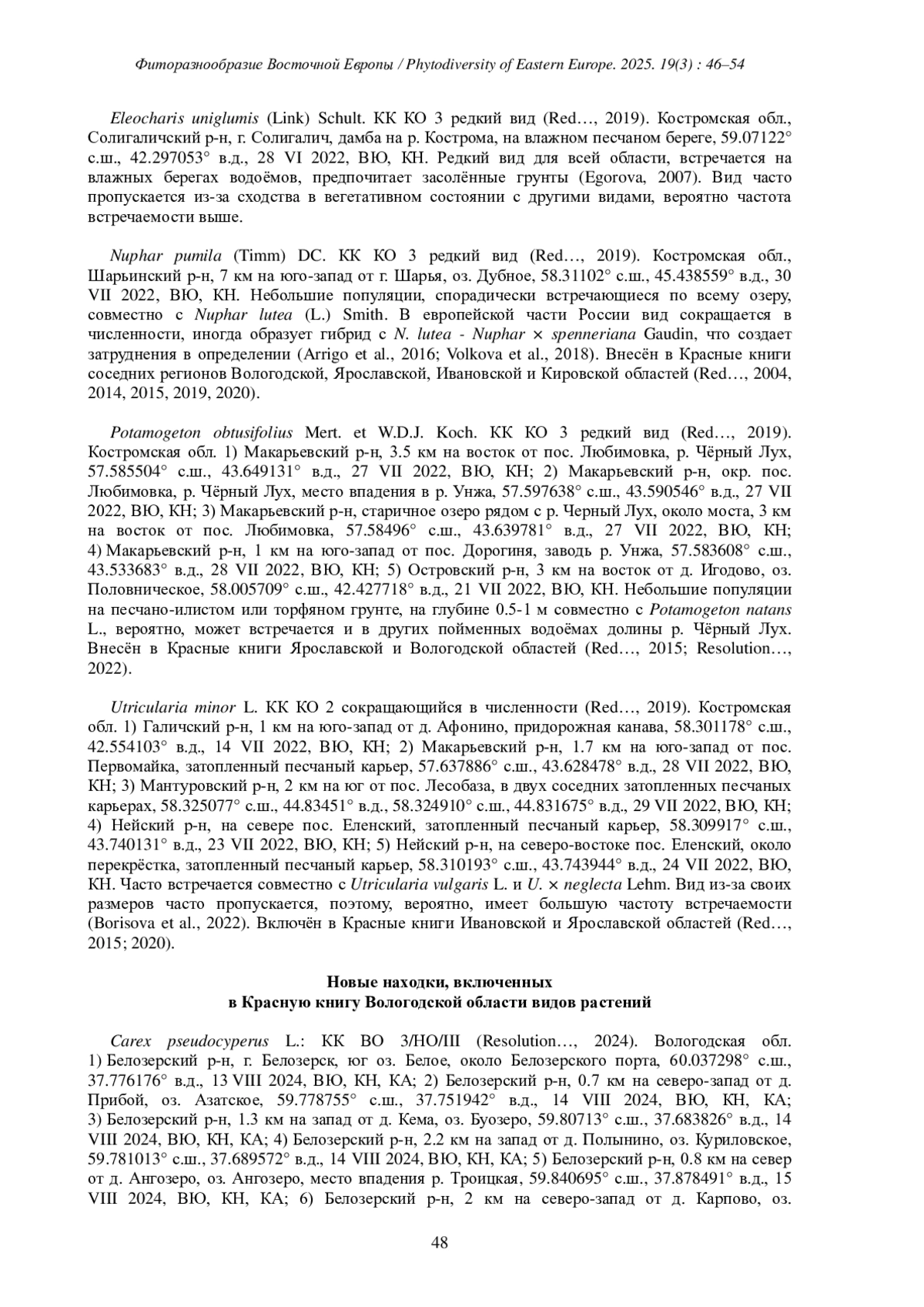 Статья: НАХОДКИ РЕДКИХ И ОХРАНЯЕМЫХ ВИДОВ ВОДНЫХ РАСТЕНИЙ КОСТРОМСКОЙ И ВОЛОГОДСКОЙ ОБЛАСТЕЙ (ИТОГИ ИССЛЕДОВАНИЙ 2022-2024 ГГ.) (2025)