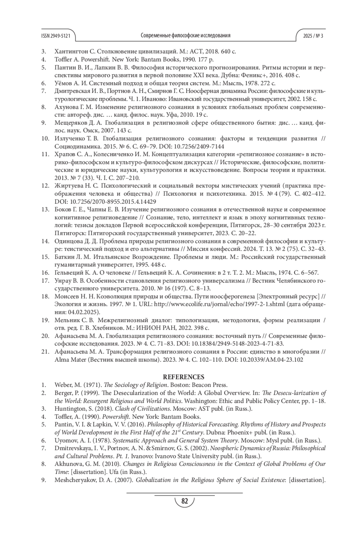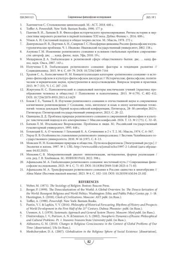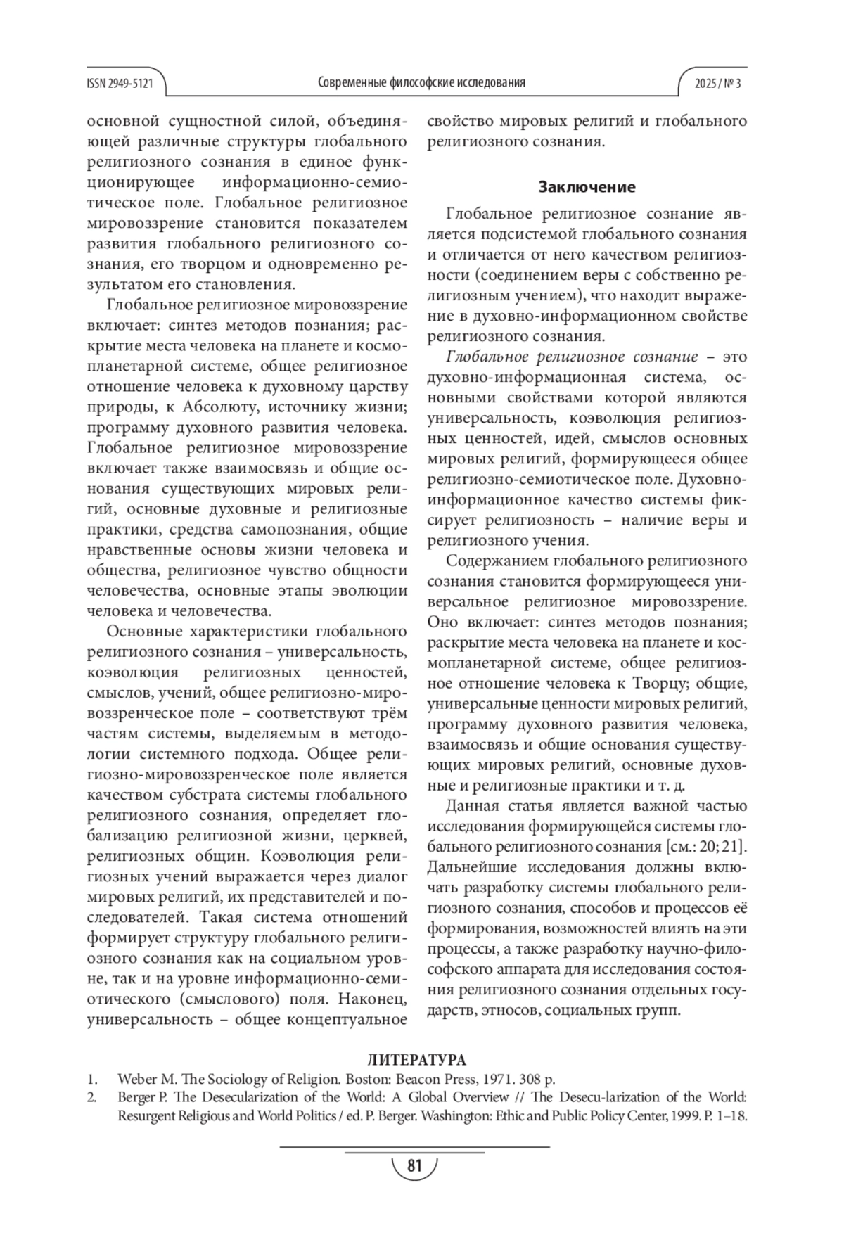 Результаты. Глобальное религиозное сознание предстаёт духовно-информационной системой, основными свойствами которой являются универсальность, коэволюция религиозных ценностей, смыслов мировых религий, формирование общего религиозно-мировоззренческого поля. Его основным содержанием становится формирующееся глобальное религиозное мировоззрение, характеризующееся универсальностью, включающее взаимосвязь и общие основания существующих мировых религий.