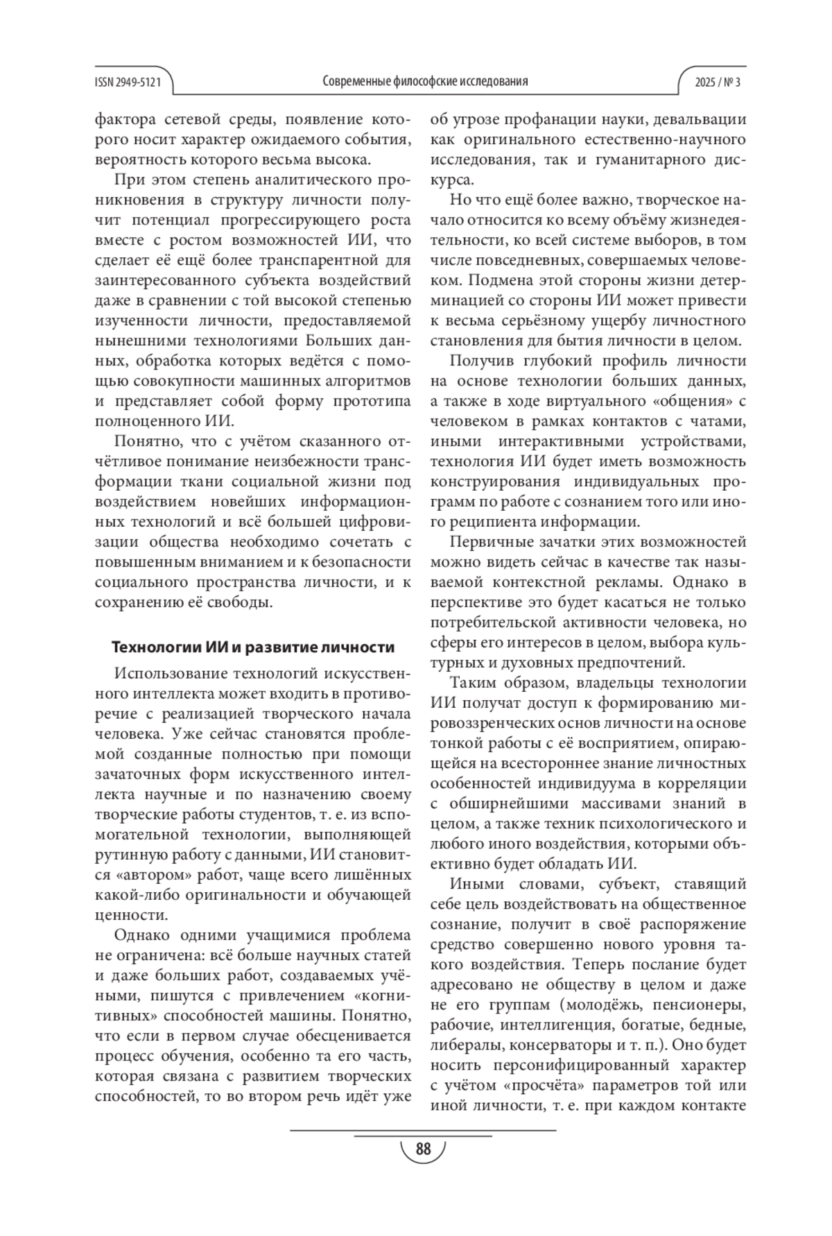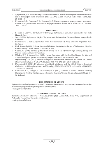ГОРБУНОВ А. С. ИСКУССТВЕННЫЙ ИНТЕЛЛЕКТ И ВЛИЯНИЕ НА ЛИЧНОСТЬ В СРЕДЕ МАССОВОЙ КОММУНИКАЦИИ // СОВРЕМЕННЫЕ ФИЛОСОФСКИЕ ИССЛЕДОВАНИЯ. 2025. № 3