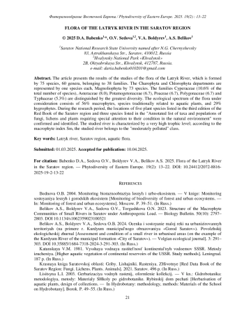 В статье приведены результаты исследований флоры реки Латрык. Она включает 75 видов, 60 родов, относящихся к 38 семействам. Отделы Charophyta и Chlorophyta представлены по одному виду, Magnoliophyta 73 видами. Наибольшим разнообразием отличаются семейства Cyperaceae (10.6% от общего числа видов), Asteraceae (8.0), Potamogetonaceae (6.7), Poaceae (6.7), Polygonaceae (6.7) и Typhaceae (5.3%). Экологический спектр рассматриваемой флоры на 56% состоит из макрофитов, видов, традиционно относящихся к водным растениям, и на 29% - из гигрофитов. В период исследований подтверждены и выявлены местонахождения пяти видов растений, занесённых в третье издание Красной книги Саратовской области и трех видов, внесённых в «Аннотированный перечень таксонов и популяций грибов, лишайников и растений, нуждающихся в особом внимании к их состоянию в природной среде». Для изученной реки характерен очень высокий уровень трофности, по макрофитному индексу Sm исследованная река относится к классу «умеренно загрязненная».
