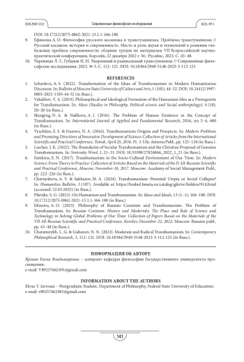 1. Щавлева А. С. Трансформация идей трансгуманизма в современном гуманитарном дискурсе // Вестник Московского государственного университета культуры и искусств. 2022. № 1 (105). С. 44-52. https://doi.org/10.24412/1997-0803-2022-1105-44-52