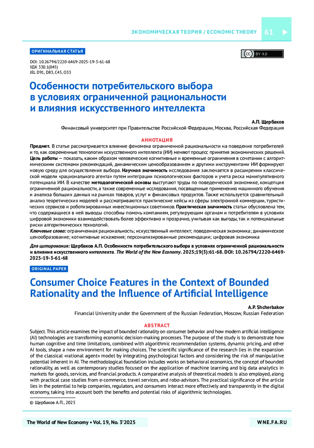 Цель работы — показать, каким образом человеческие когнитивные и временные ограничения в сочетании с алгоритмическими системами рекомендаций, динамическим ценообразованием и другими инструментами ИИ формируют новую среду для осуществления выбора.