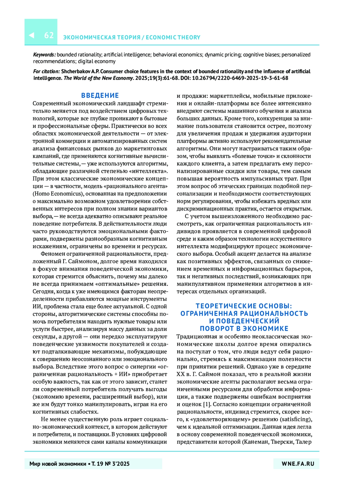 Предмет. В статье рассматривается влияние феномена ограниченной рациональности на поведение потребителей и то, как современные технологии искусственного интеллекта (ИИ) меняют процесс принятия экономических решений.