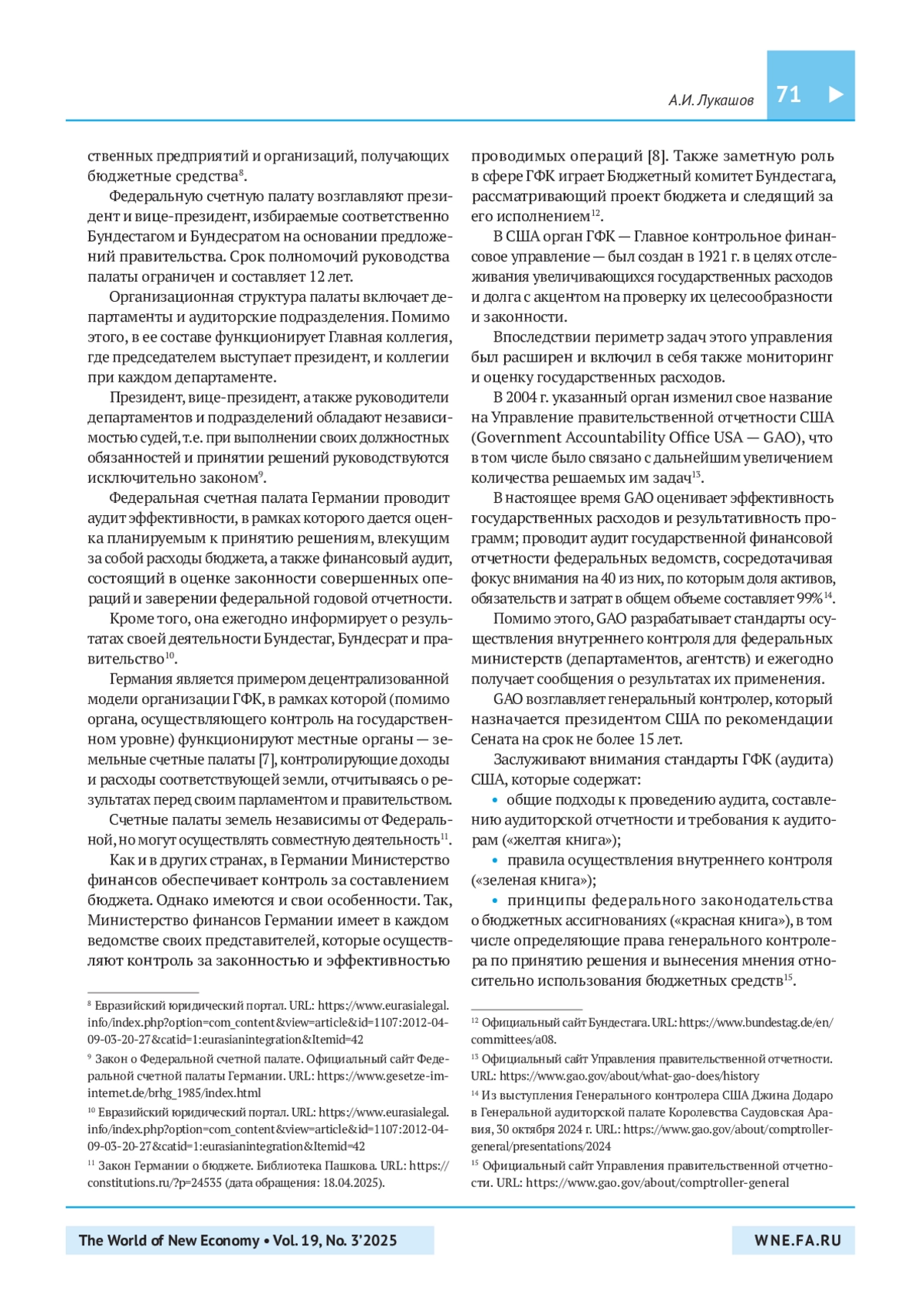 1. Лукашов А.И., Институциональная эволюция государственного финансового контроля в России. Аудит. 2022;(6):2-7.