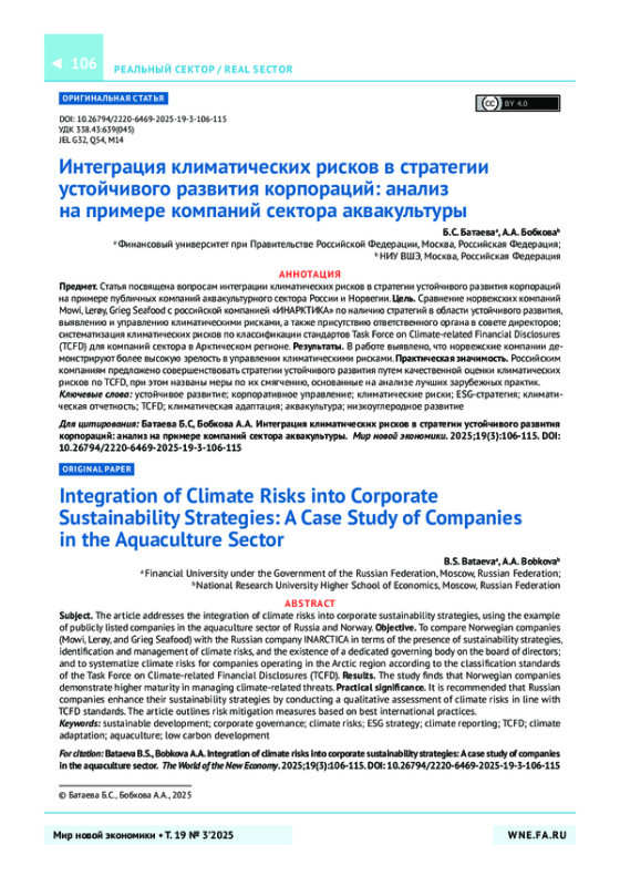 Цель. Сравнение норвежских компаний Mowi, Lerøy, Grieg Seafood с российской компанией «ИНАРКТИКА» по наличию стратегий в области устойчивого развития, выявлению и управлению климатическими рисками, а также присутствию ответственного органа в совете директоров; систематизация климатических рисков по классификации стандартов Task Force on Climate-related Financial Disclosures (TCFD) для компаний сектора в Арктическом регионе.