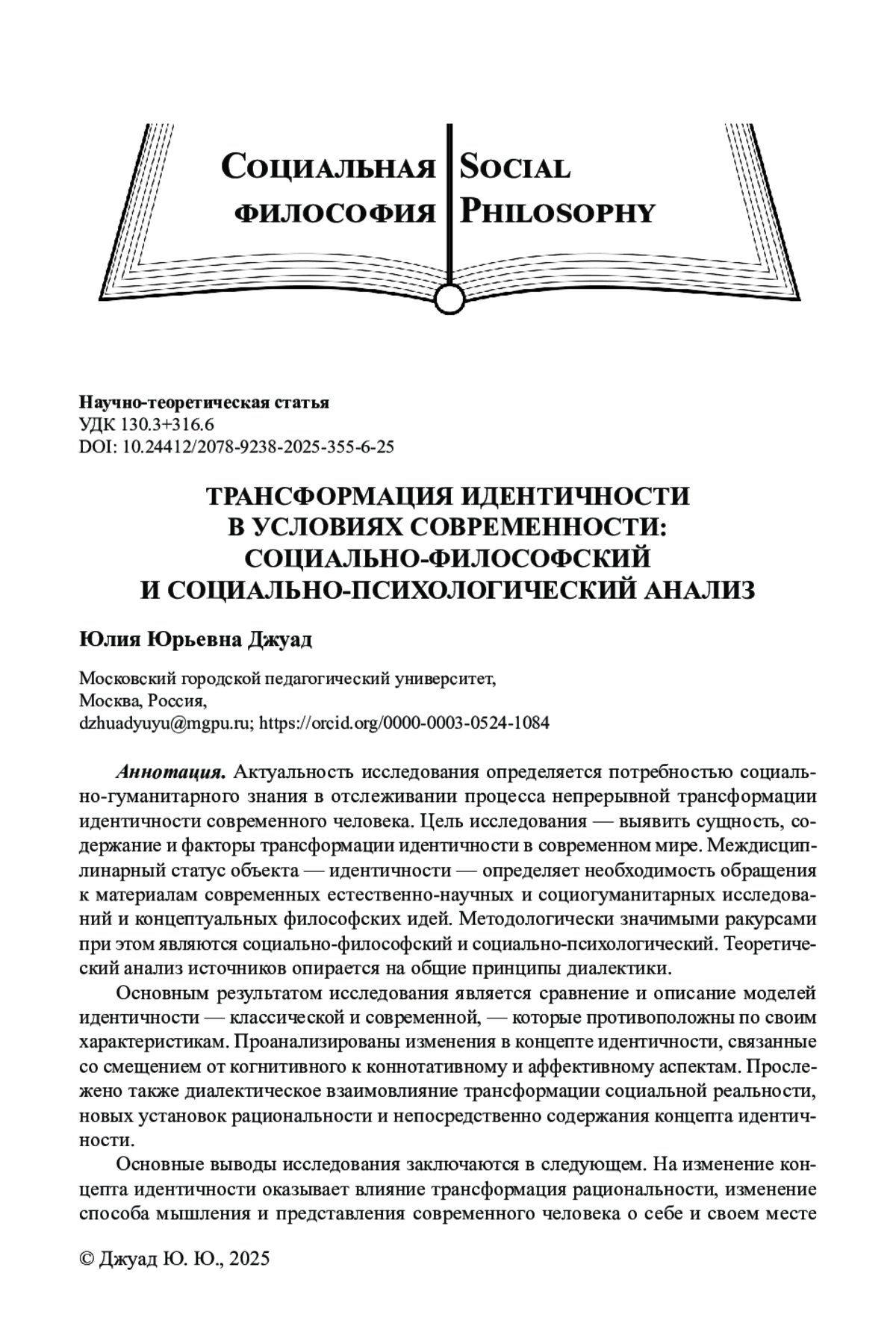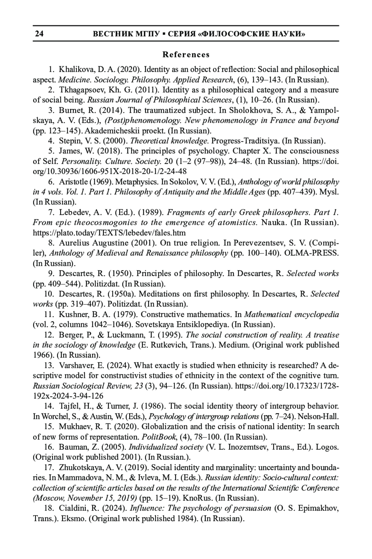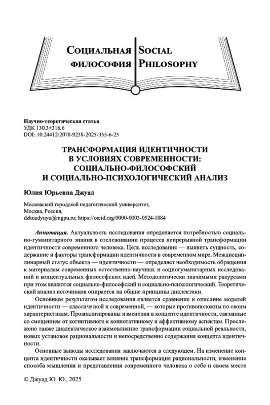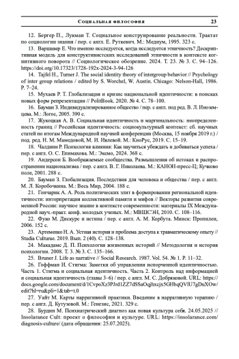 1. Халикова Д. А. Идентичность как объект рефлексии: социально-философский аспект // Медицина. Социология. Философия. Прикладные исследования. № 6. 2020. С.139-143. EDN: CGPMNJ