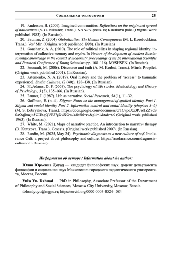 17. Жукоцкая А. В. Социальная идентичность и маргинальность: неопределенность границ // Российская идентичность: социокультурный контекст: сб. научных статей по итогам Международной научной конференции (Москва, 15 ноября 2019 г.) / под. ред. Н. М. Мамедовой, М. И. Ивлевой. М.: КноРус, 2019. С. 15-19. EDN: DYGDHZ