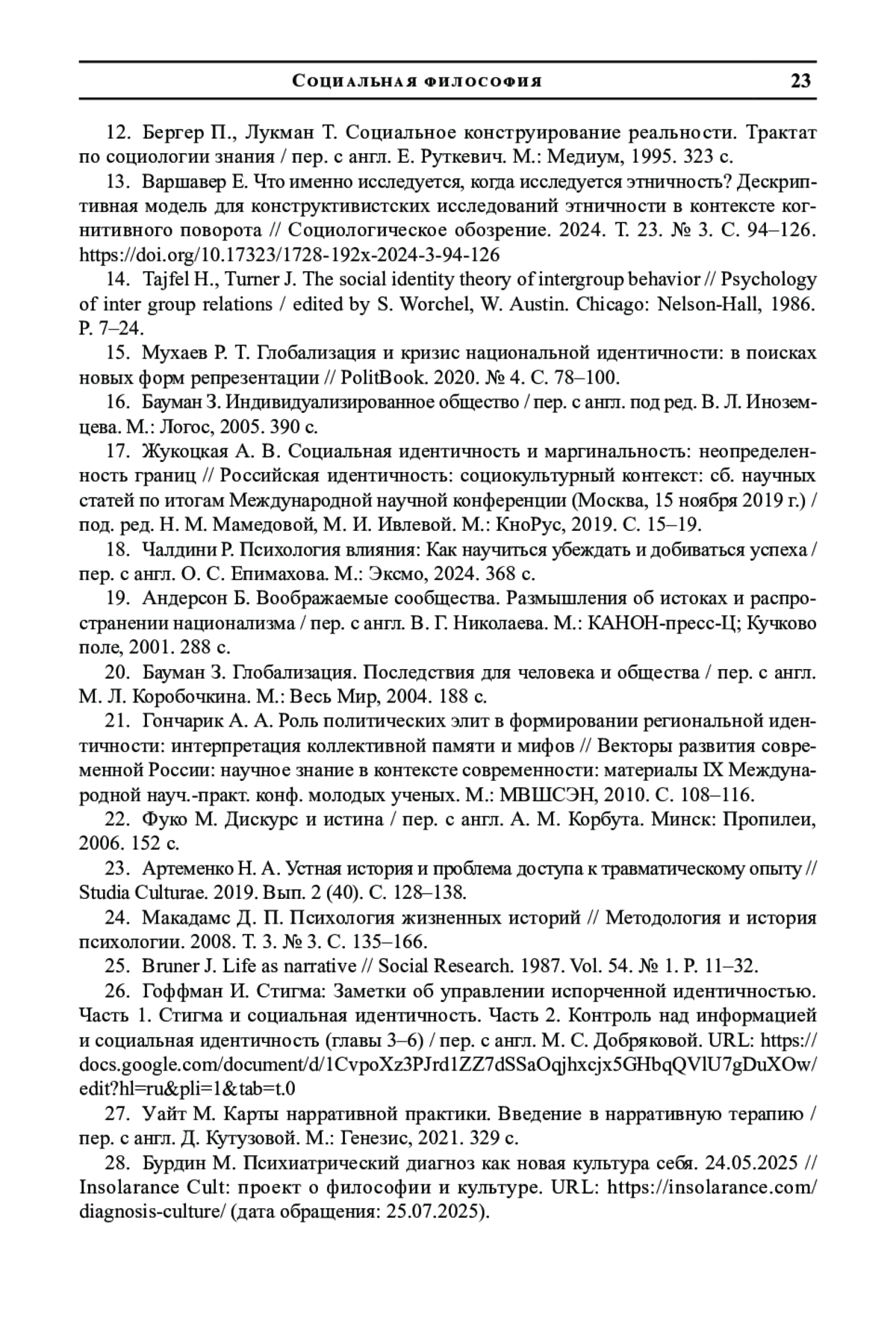12. Бергер П., Лукман Т. Социальное конструирование реальности. Трактат по социологии знания / пер. с англ. Е. Руткевич. М.: Медиум, 1995. 323 с.