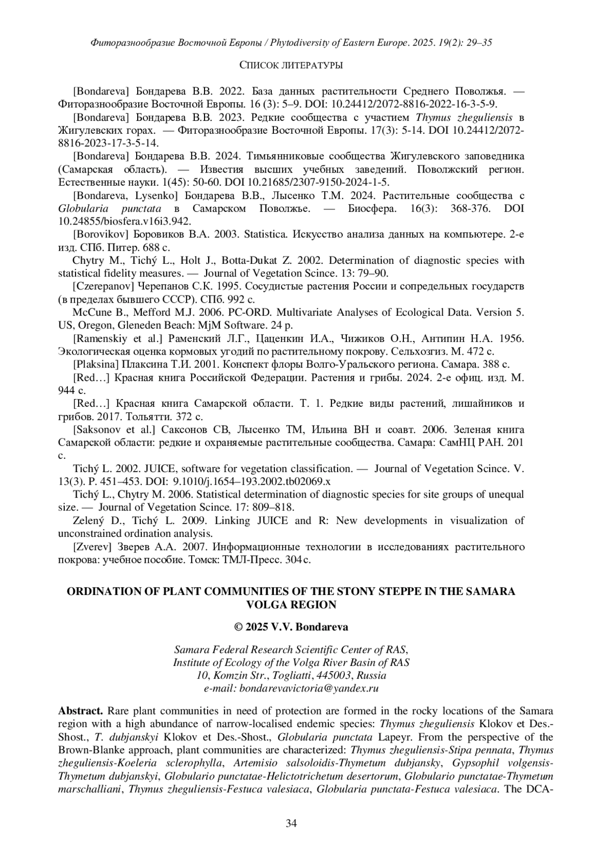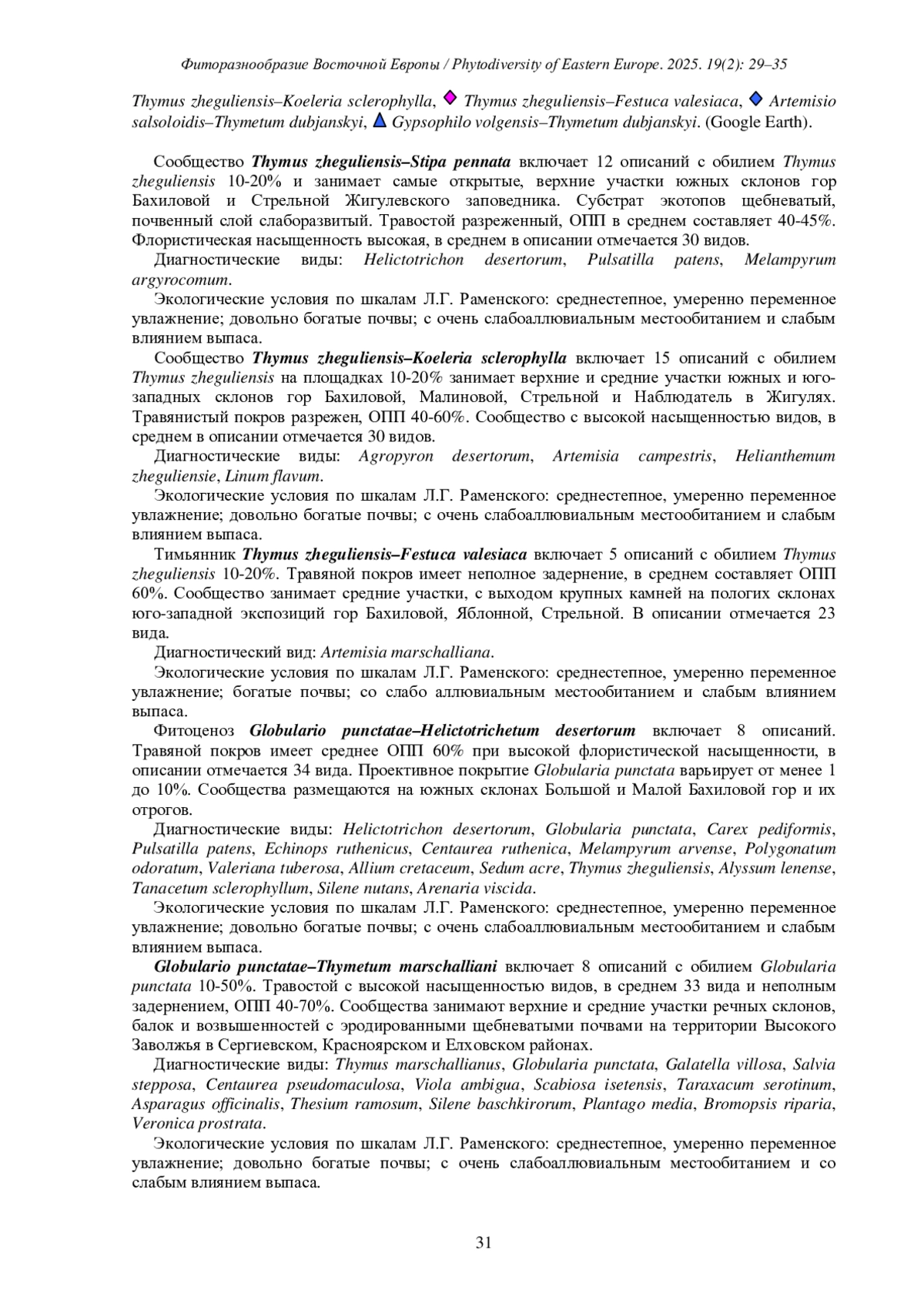 2. [Bondareva] Бондарева В.В. 2023. Редкие сообщества с участием Thymus zheguliensis в Жигулевских горах. - Фиторазнообразие Восточной Европы. 17(3): 5-14. DOI: 10.24412/2072-8816-2023-17-3-5-14 EDN: POWYBU