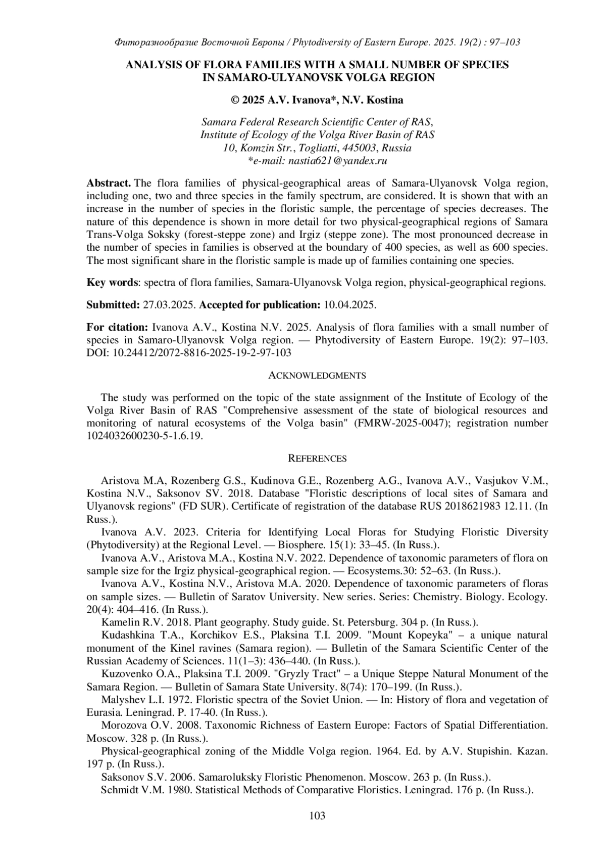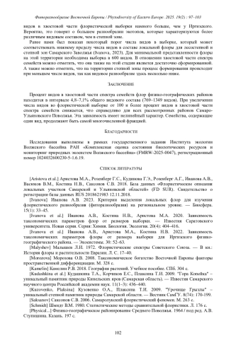 4. [Ivanova et al.] Иванова А.В., Аристова М.А., Костина Н.В. 2022. Зависимость таксономических параметров флоры от размера выборки для Иргизского физико-географического района. - Экосистемы. 30: 52-63.