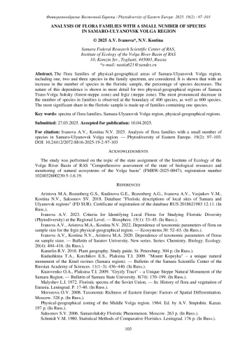 2. [Ivanova] Иванова А.В. 2023. Критерии выделения локальных флор для изучения флористического разнообразия (фиторазнообразия) на региональном уровне. - Биосфера. 15(1): 33-45. EDN: JTXKEM