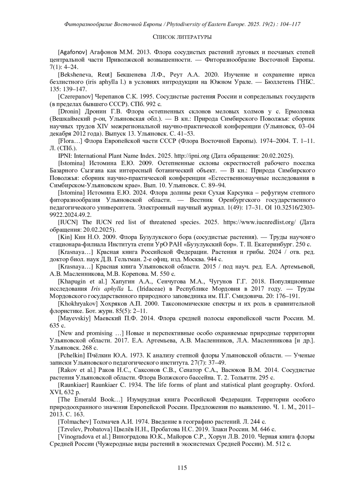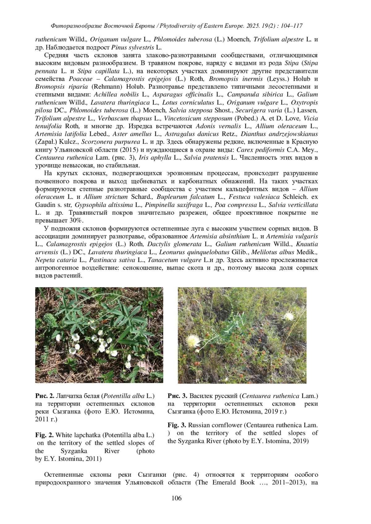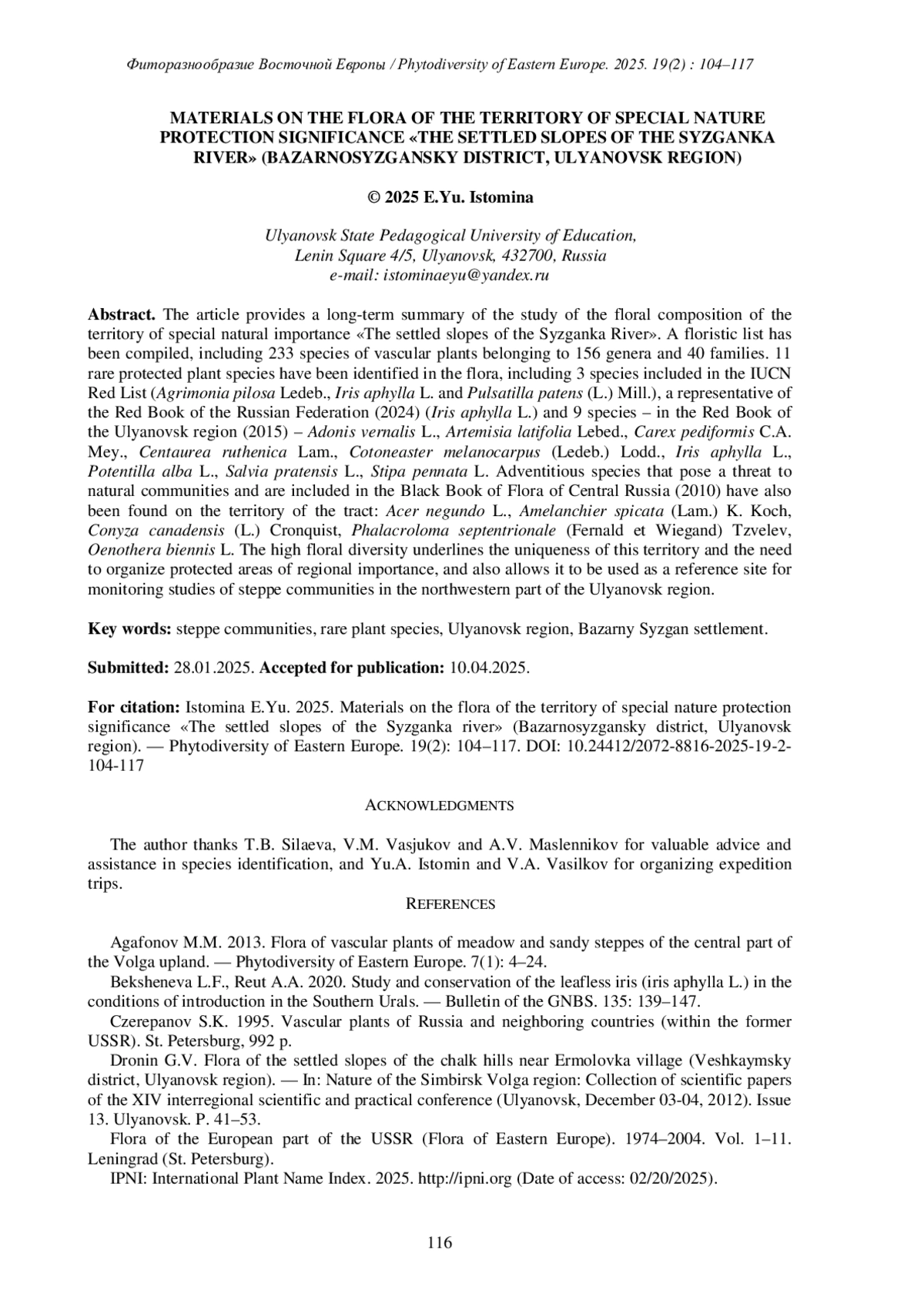 ИСТОМИНА Е.Ю. МАТЕРИАЛЫ К ФЛОРЕ ТЕРРИТОРИИ ОСОБОГО ПРИРОДООХРАННОГО ЗНАЧЕНИЯ «ОСТЕПНЕННЫЕ СКЛОНЫ РЕКИ СЫЗГАНКИ» (БАЗАРНОСЫЗГАНСКИЙ РАЙОН, УЛЬЯНОВСКАЯ ОБЛАСТЬ) // ФИТОРАЗНООБРАЗИЕ ВОСТОЧНОЙ ЕВРОПЫ. 2025. Т. 19 № 2