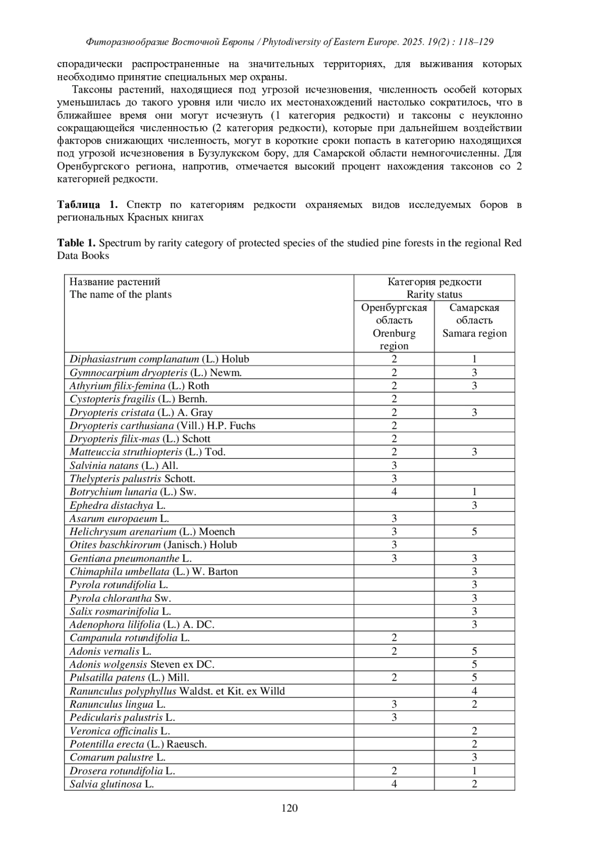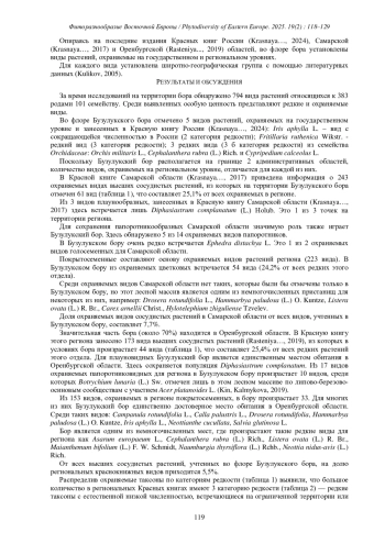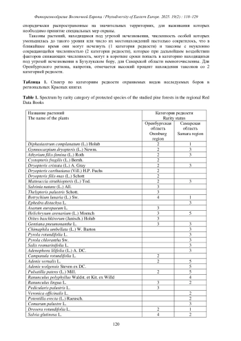 Среди охраняемых видов Самарской области нет таких, которые были бы отмечены только в Бузулукском бору, но этот лесной массив является одним из немногочисленных пристанищ для некоторых из них, например: Drosera rotundifolia L., Hammarbya paludosa (L.) O. Kuntze, Listera ovata (L.) R. Br., Carex arnellii Christ., Hylotelephium zhiguliense Tzvelev. Доля охраняемых видов сосудистых растений в Самарской области от всех видов, учтенных в Бузулукском бору, составляет 7,7%. Значительная часть бора (около 70%) находится в Оренбургской области. В Красную книгу этого региона занесено 173 вида высших сосудистых растений (Rasteniya…, 2019), из которых в условиях бора произрастает 44 вида (таблица 1), что составляет 25,4% от всех редких растений этого отдела. Для плауновидных Бузулукский бор является единственным местом обитания в Оренбургской области. Здесь сохраняется популяция Diphasiastrum complanatum. Из 17 видов охраняемых папоротниковидных для региона в Бузулукском бору произрастает 10 видов, среди которых Botrychium lunaria (L.) Sw. отмечен лишь в этом лесном массиве по липово-березовоосиновым сообществам с участием Acer platanoides L. (Kin, Kalmykova, 2019).
