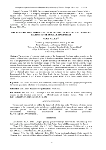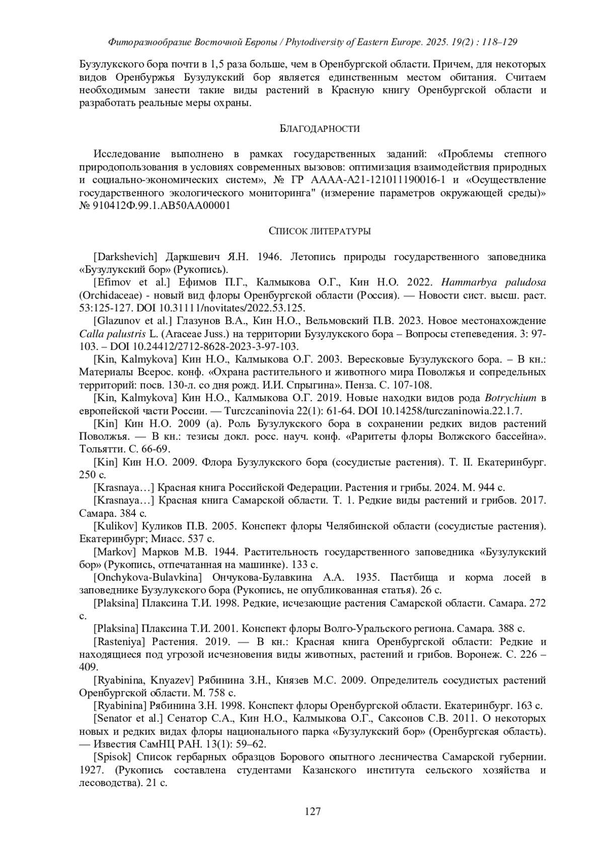 18. [Senator et al.] Сенатор С.А., Кин Н.О., Калмыкова О.Г., Саксонов С.В. 2011. О некоторых новых и редких видах флоры национального парка “Бузулукский бор” (Оренбургская область). - Известия СамНЦ РАН. 13(1): 59-62. EDN: NXKBVV