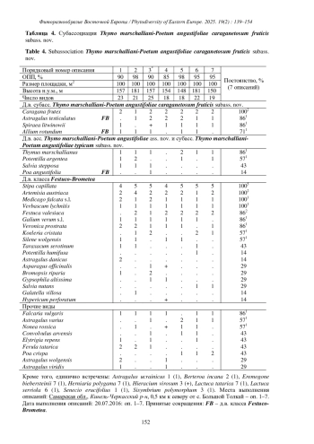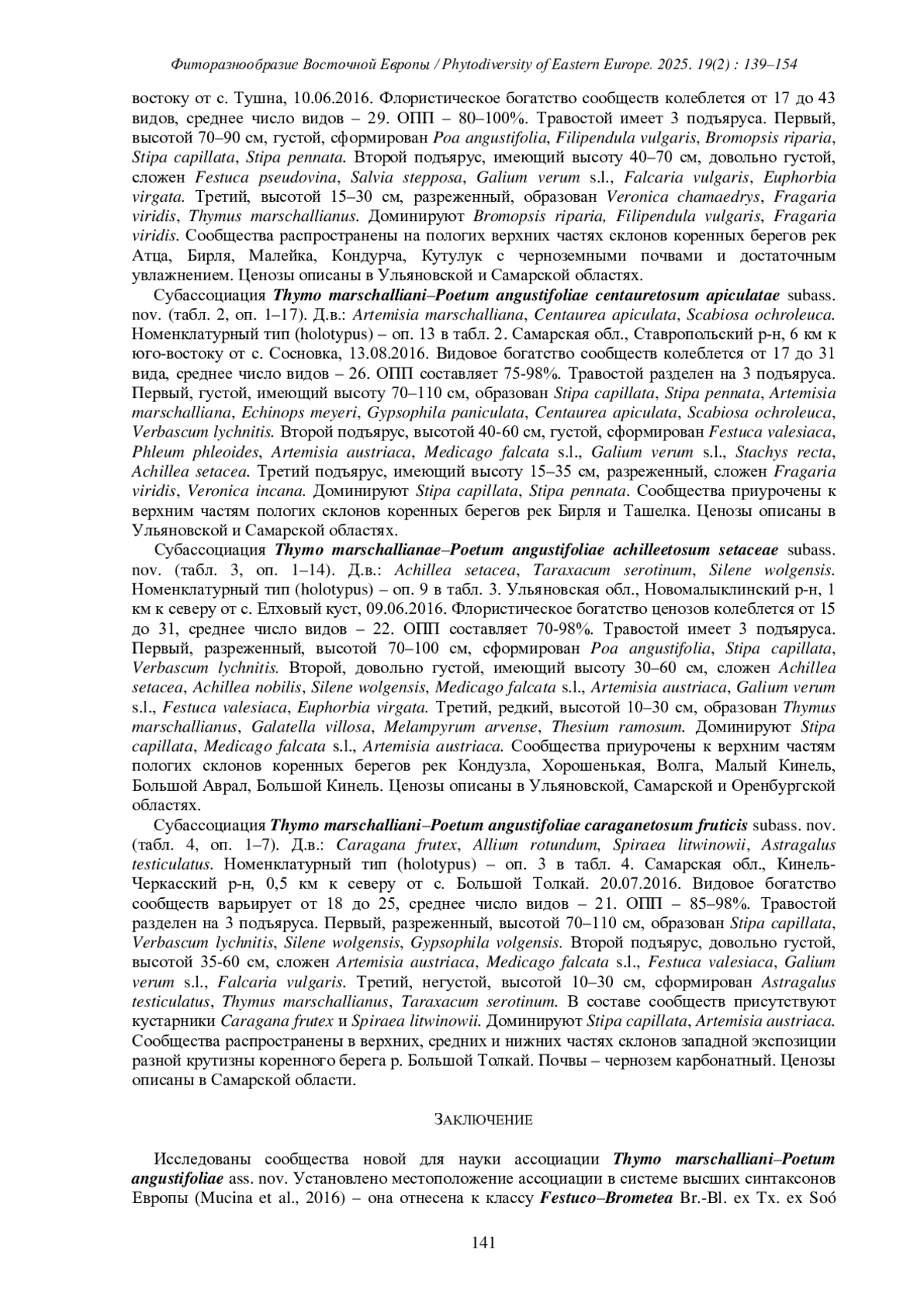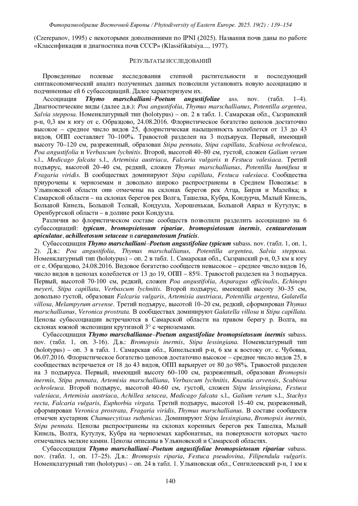 Ассоциация Thymo marschalliani–Poetum angustifoliae ass. nov. (табл. 1–4). Диагностические виды (далее д. в.): Poa angustifolia, Thymus marschallianus, Potentilla argentea, Salvia stepposa. Номенклатурный тип (holotypus) – оп. 2 в табл. 1. Самарская обл., Сызранский р-н, 0,3 км к югу от с. Образцово, 24.08.2016. Флористическое богатство ценозов достаточно высокое – среднее число видов 25, флористическая насыщенность колеблется от 13 до 43 видов, ОПП составляет 70–100%. Травостой разделен на 3 подъяруса. Первый, имеющий высоту 70–120 см, разреженный, образован Stipa pennata, Stipa capillata, Scabiosa ochroleuca, Poa angustifolia и Verbascum lychnitis. Второй, высотой 40–80 см, густой, сложен Galium verum s. l., Medicago falcata s. l., Artemisia austriaca, Falcaria vulgaris и Festuca valesiaca. Третий подъярус, высотой 20–40 см, редкий, сложен Thymus marschallianus, Potentilla humifusa и Fragaria viridis. В сообществах доминируют Stipa capillata, Festuca valesiaca. Сообщества приурочены к черноземам и довольно широко распространены в Среднем Поволжье: в Ульяновской области они отмечены на склонах берегов рек Атца, Бирля и Малейка; в Самарской области – на склонах берегов рек Волга, Ташелка, Кубра, Кондурча, Малый Кинель, Большой Кинель, Большой Толкай, Кондузла, Хорошенькая, Большой Аврал и Кутулук; в Оренбургской области – в долине реки Кондузла.