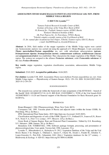 6. Lysenko T., Mitroshenkova A., Kalmykova O. 2012. Vegetation Database of the Volga and the Ural Rivers Basins // In: Dengler J., Oldeland J., Jansen F., Chytrý M., Ewald J., Finckh M., Glöckler F., Lopez-Gonzalez G., Peet R.K., Schaminée J.H.J. [Eds.]: Vegetation databases for the 21st century. - Biodiversity & Ecology. 4: 420-421. https://doi.org/10.7809.b-e.00208.