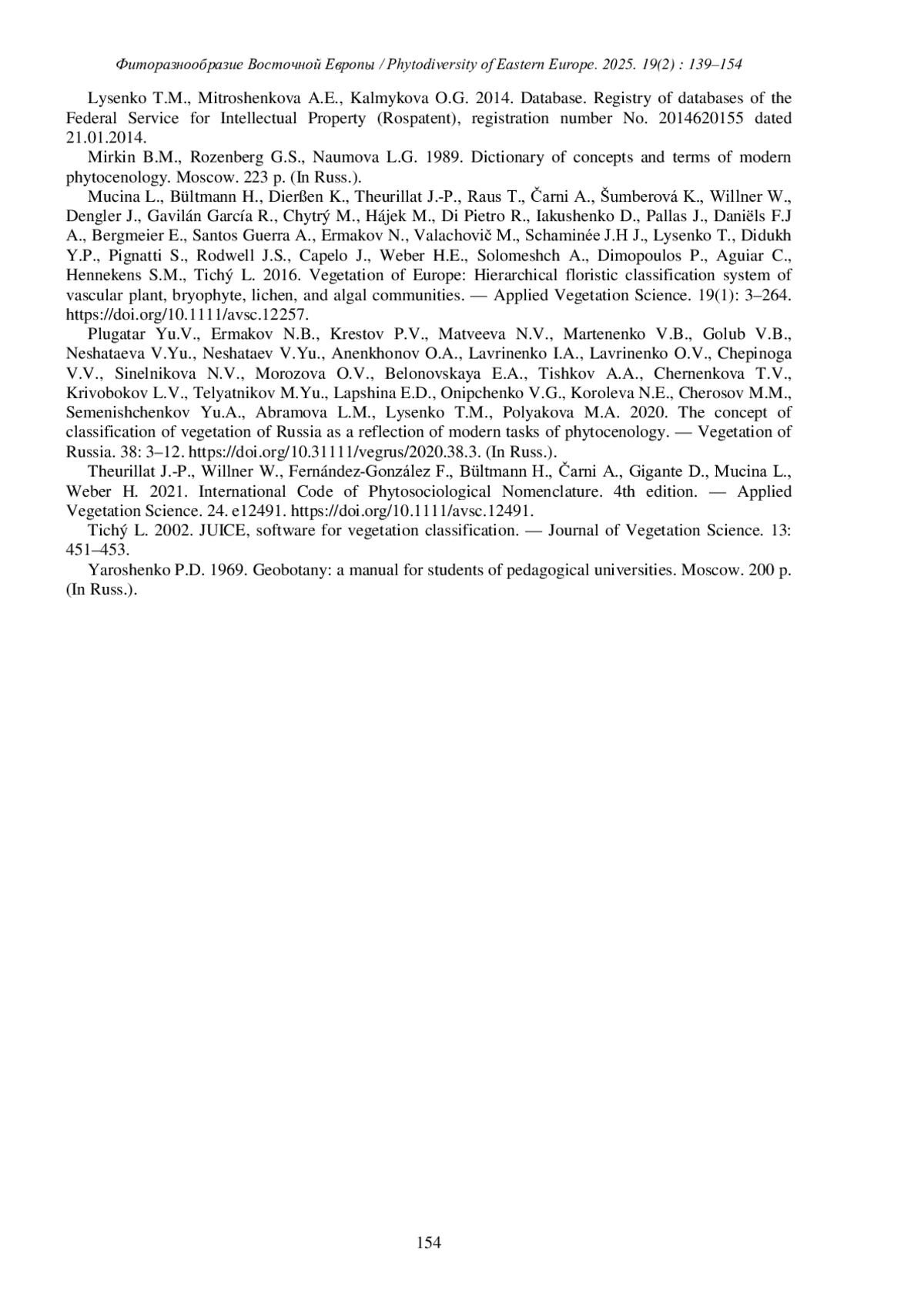 8. Mucina L., Bültmann H., Dierßen K., Theurillat J.-P., Raus T., Čarni A., Šumberová K., Willner W., Dengler J., Gavilán García R., Chytrý M., Hájek M., Di Pietro R., Iakushenko D., Pallas J., Daniëls F.J A., Bergmeier E., Santos Guerra A., Ermakov N., Valachovič M., Schaminée J.H J., Lysenko T., Didukh Y.P., Pignatti S., Rodwell J.S., Capelo J., Weber H.E., Solomeshch A., Dimopoulos P., Aguiar C., Hennekens S.M., Tichý L. 2016. Vegetation of Europe: Hierarchical floristic classification system of vascular plant, bryophyte, lichen, and algal communities. - Applied Vegetation Science. 19(1): 3-264. DOI: 10.1111/avsc.12257 EDN: XLIMMN