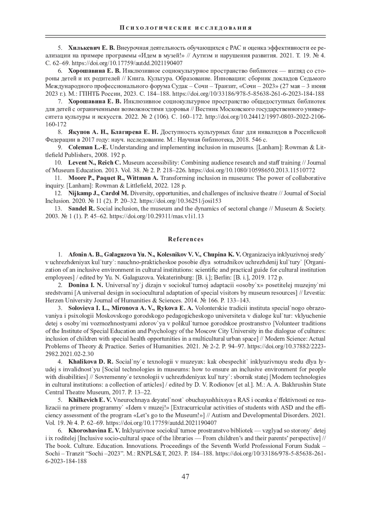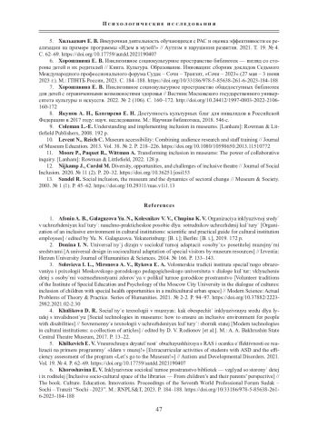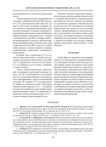 Вместе с тем в процессе исследования обнаружен дефицит компетенций специалистов учреждений культуры при взаимодействии с данной категорией посетителей, выявлена сниженная мотивация к овладению навыками конструктивного взаимодействия. Все это указывает на необходимость осознания перемен в обществе, развитие инклюзивных процессов, создание специальных условий для организации доступной среды, повышения инклюзивной культуры среди сотрудников учреждений, участвующих в исследовании.