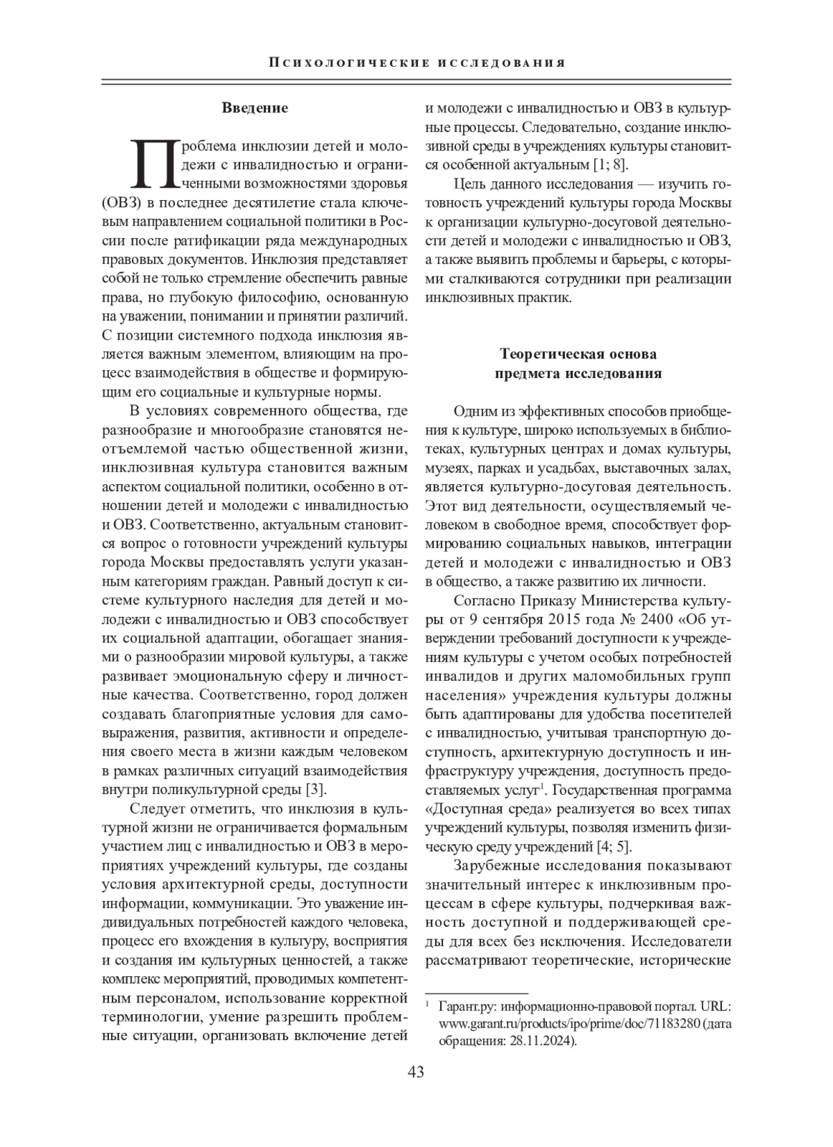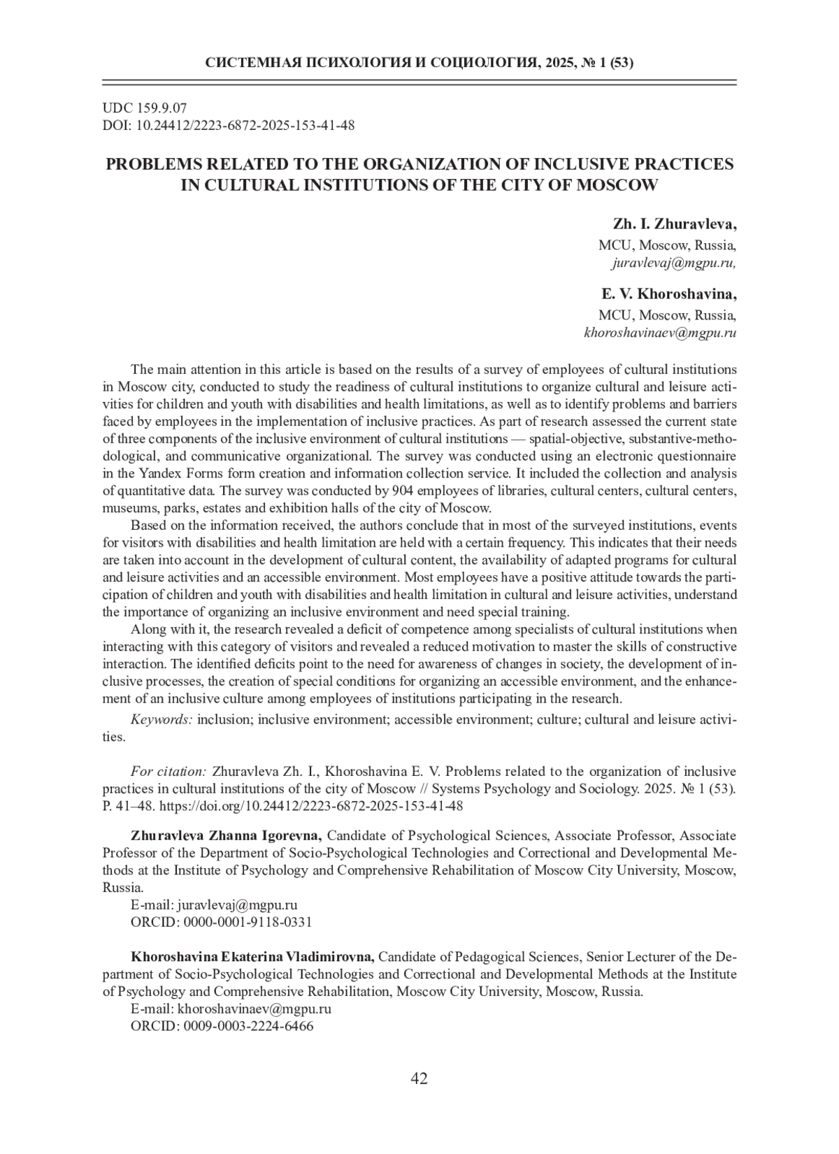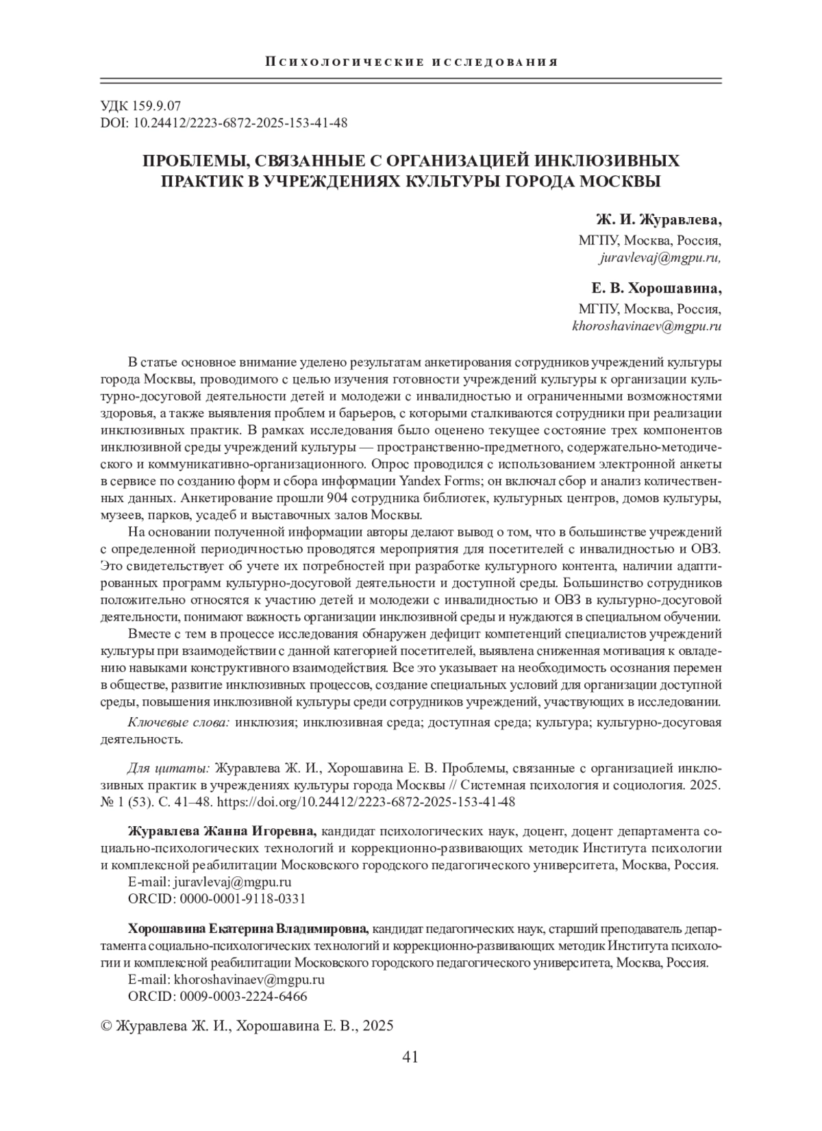 В статье основное внимание уделено результатам анкетирования сотрудников учреждений культуры города Москвы, проводимого с целью изучения готовности учреждений культуры к организации культурно-досуговой деятельности детей и молодежи с инвалидностью и ограниченными возможностями здоровья, а также выявления проблем и барьеров, с которыми сталкиваются сотрудники при реализации инклюзивных практик. В рамках исследования было оценено текущее состояние трех компонентов инклюзивной среды учреждений культуры - пространственно-предметного, содержательно-методического и коммуникативно-организационного. Опрос проводился с использованием электронной анкеты в сервисе по созданию форм и сбора информации Yandex Forms; он включал сбор и анализ количественных данных. Анкетирование прошли 904 сотрудника библиотек, культурных центров, домов культуры, музеев, парков, усадеб и выставочных залов Москвы.