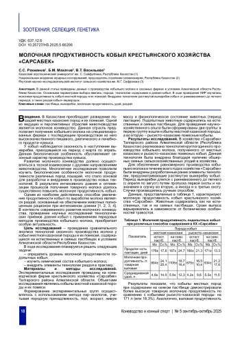 4. Шарапатов Т.С., Асанбаев Т.Ш., Шауенов С.К., Ибраева А.К., Смаил А.С. Молочная продуктивность кобыл разного генотипа в условиях табунного содержания // Вестник науки Казахского агротехнического университета им. С. Сейфуллина. 2022. № 1 (112). С. 233-241.