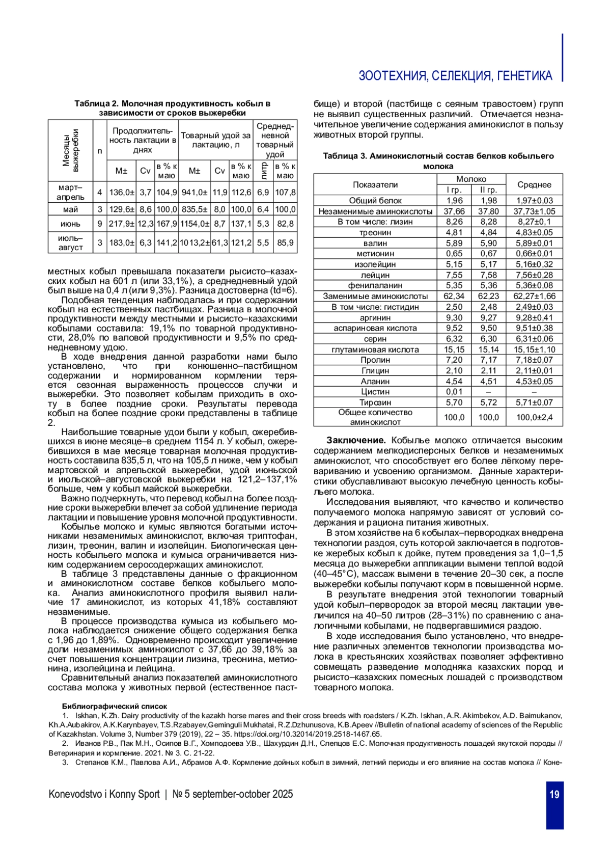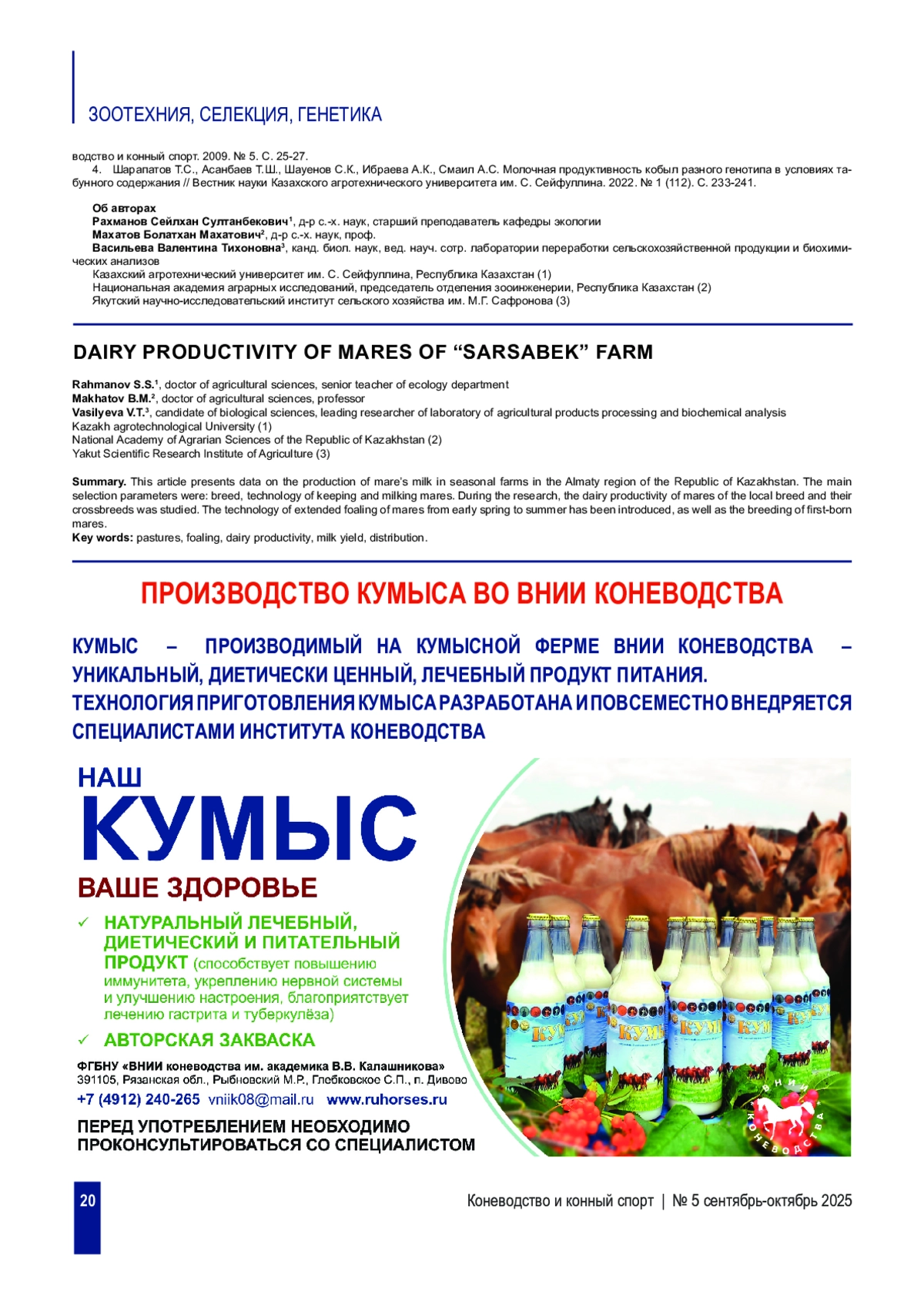 1. Iskhan, K.Zh. Dairy productivity of the kazakh horse mares and their cross breeds with roadsters / K.Zh. Iskhan, A.R. Akimbekov, A.D. Baimukanov, Kh.A.Aubakirov, A.K.Karynbayev, T.S.Rzabayev,Geminguli Mukhatai, R.Z.Dzhunusova, K.B.Apeev //Bulletin of national academy of sciences of the Republic of Kazakhstan. Volume 3, Number 379 (2019), 22 - 35. DOI: 10.32014/2019.2518-1467.65