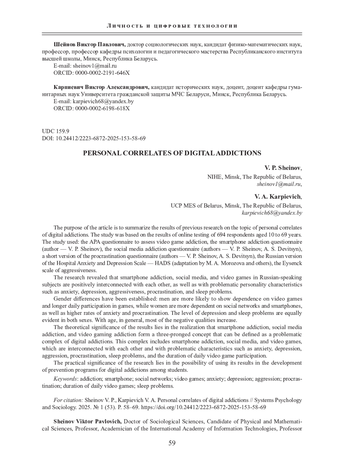 Цель статьи - обобщение результатов ранее проведенных исследований на тему личностных коррелятов цифровой зависимости. Основой исследования послужили результаты онлайн-тестирования 694 респондентов в возрасте от 10 до 69 лет. В исследовании использованы опросник APA для оценки зависимости от видеоигр, опросник зависимости от смартфона (автор - В. П. Шейнов), опросник зависимости от социальных сетей (авторы - В. П. Шейнов, А. С. Девицын), короткая версия опросника прокрастинации (авторы - В. П. Шейнов, А. С. Девицын), русскоязычная версия Госпитальной шкалы тревоги и депрессии / Hospital Anxiety and Depression Scale - HADS (адаптация М. А. Морозовой и др.), шкала агрессивности Х. Ю. Айзенка.