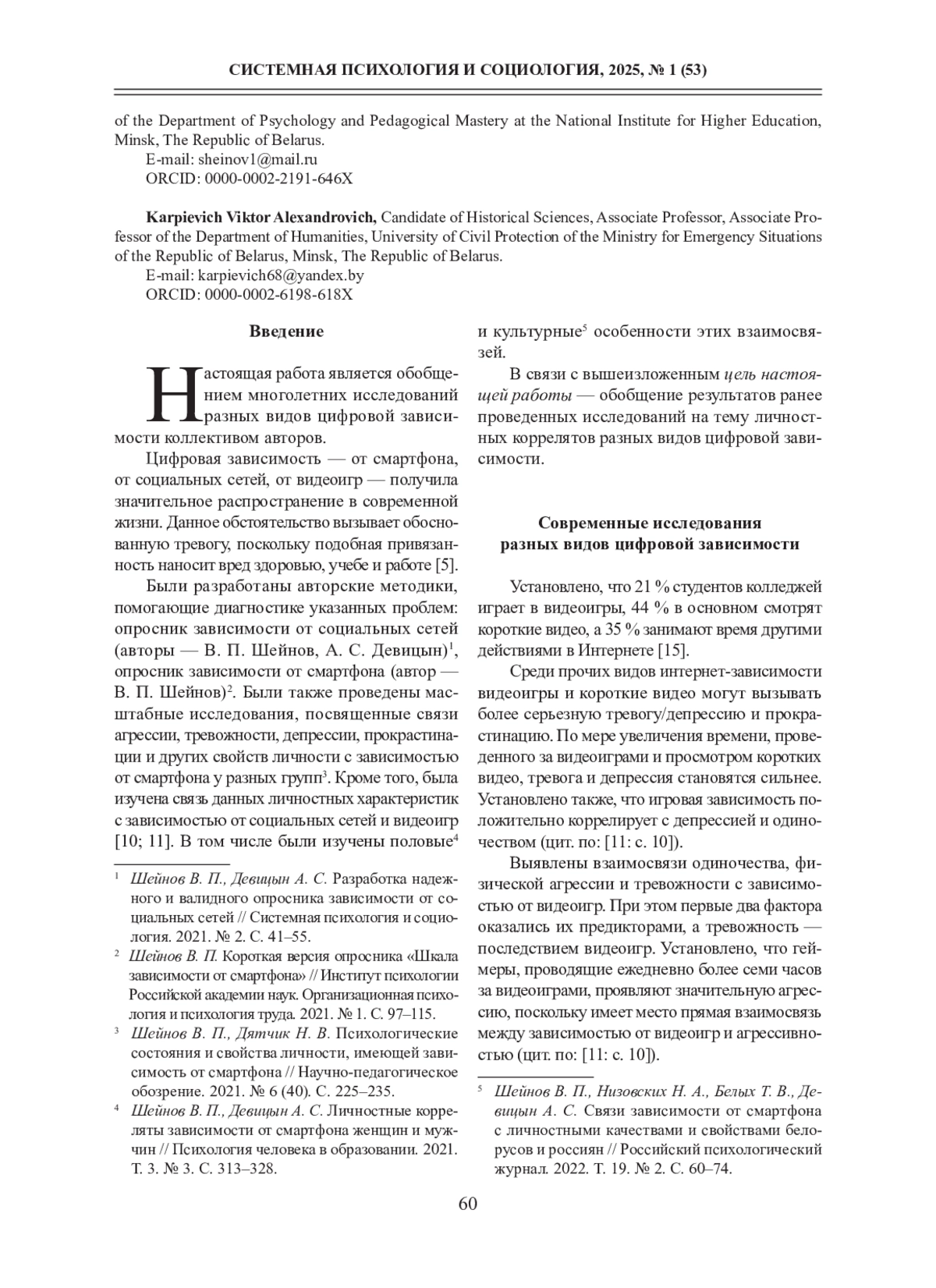 11. Шейнов В. П., Карпиевич В. А. Личностные корреляты зависимости от компьютерных игр // Институт психологии Российской академии наук. Социальная и экономическая психология. 2024. Т. 9. № 4 (36). С. 6-24. DOI: 10.38098/ipran.sep_2024_36_4_01 EDN: BTLXZM