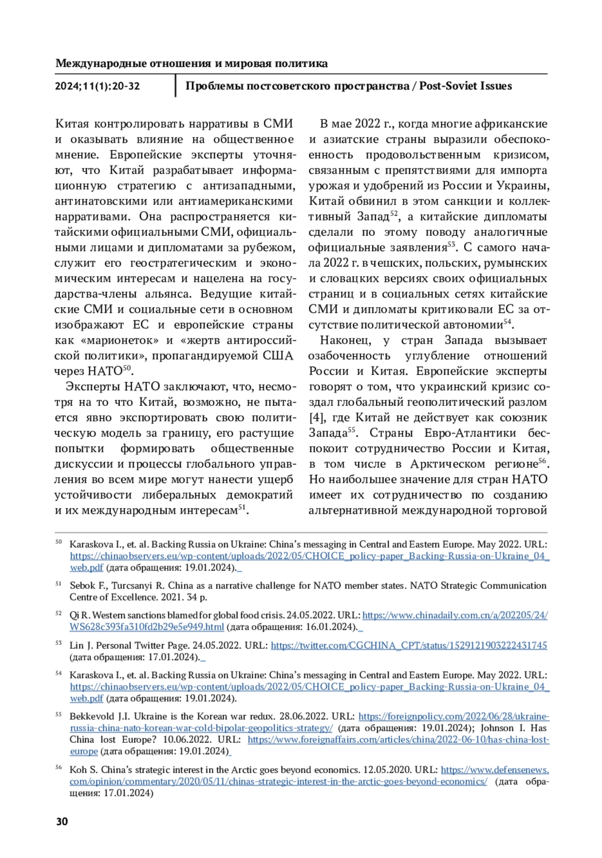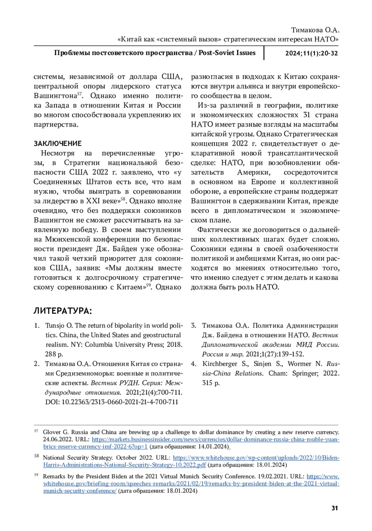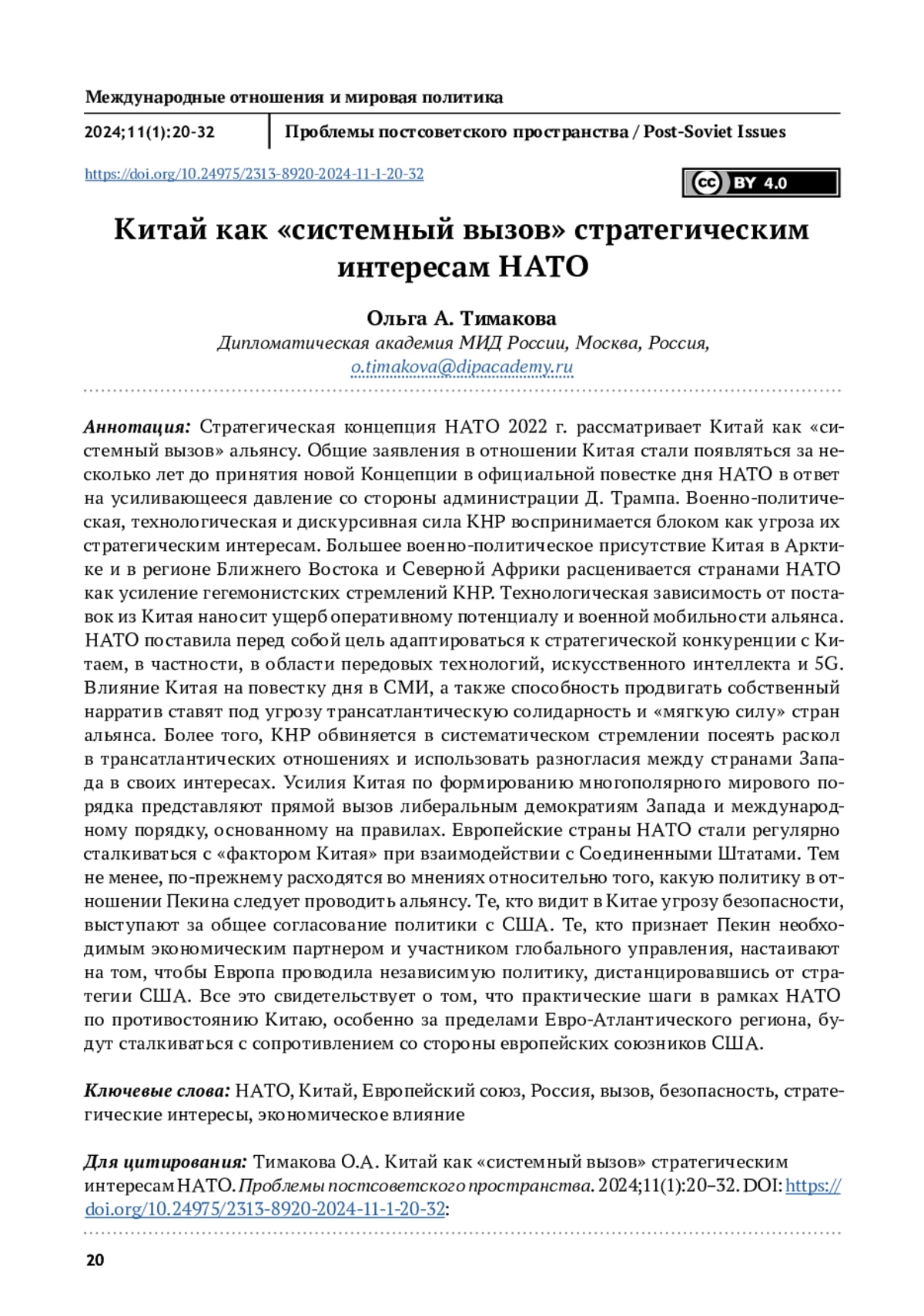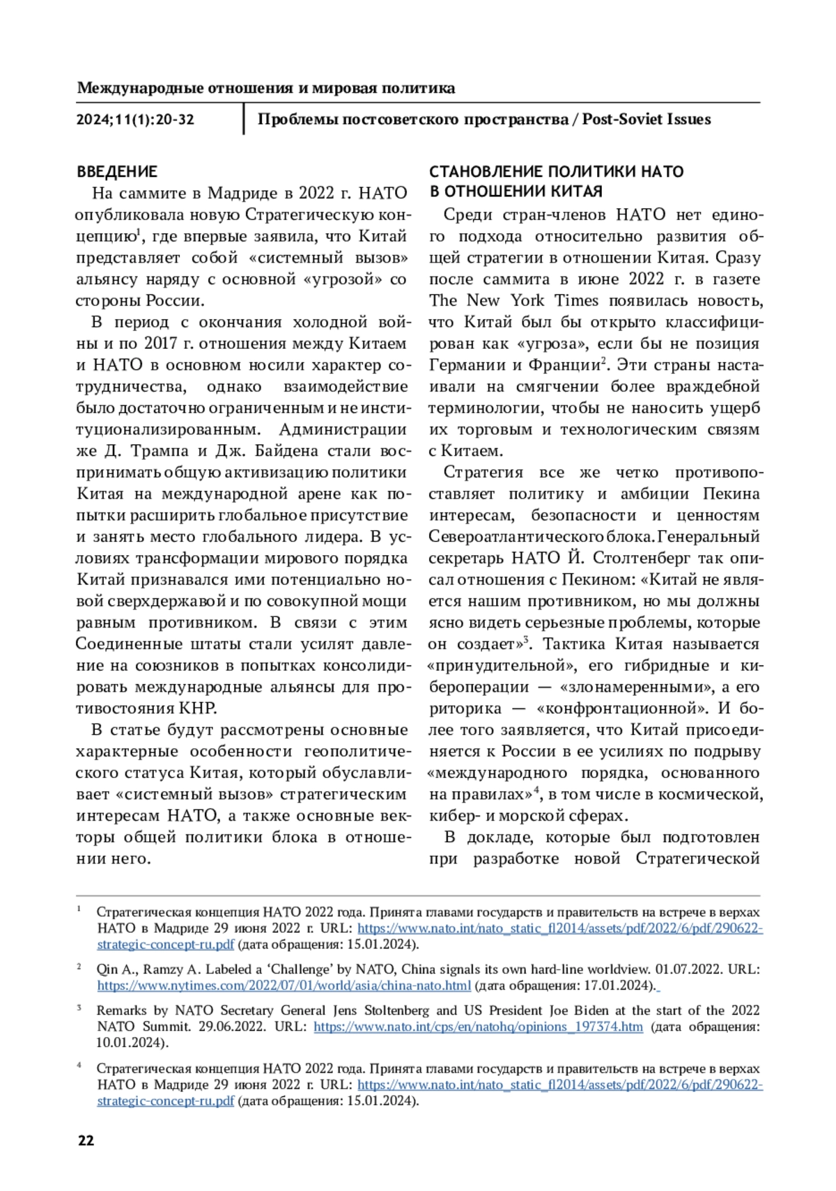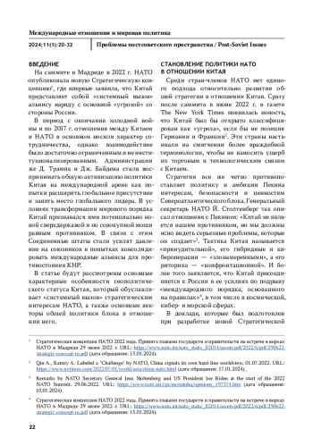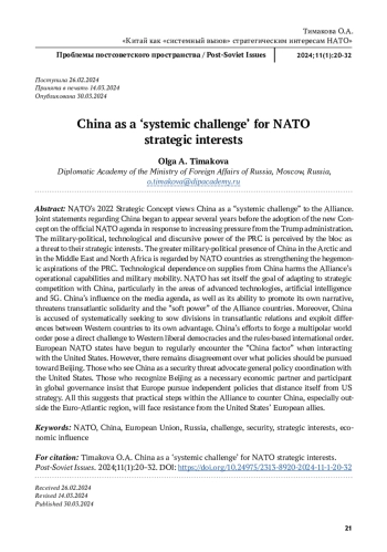 Стратегическая концепция НАТО 2022 г. рассматривает Китай как «системный вызов» альянсу. Общие заявления в отношении Китая стали появляться за несколько лет до принятия новой Концепции в официальной повестке дня НАТО в ответ на усиливающееся давление со стороны администрации Д. Трампа. Военно-политическая, технологическая и дискурсивная сила КНР воспринимается блоком как угроза их стратегическим интересам. Большее военно-политическое присутствие Китая в Арктике и в регионе Ближнего Востока и Северной Африки расценивается странами НАТО как усиление гегемонистских стремлений КНР. Технологическая зависимость от поставок из Китая наносит ущерб оперативному потенциалу и военной мобильности альянса. НАТО поставила перед собой цель адаптироваться к стратегической конкуренции с Китаем, в частности, в области передовых технологий, искусственного интеллекта и 5G. Влияние Китая на повестку дня в СМИ, а также способность продвигать собственный нарратив ставят под угрозу трансатлантическую солидарность и «мягкую силу» стран альянса. Более того, КНР обвиняется в систематическом стремлении посеять раскол в трансатлантических отношениях и использовать разногласия между странами Запада в своих интересах. Усилия Китая по формированию многополярного мирового порядка представляют прямой вызов либеральным демократиям Запада и международному порядку, основанному на правилах. Европейские страны НАТО стали регулярно сталкиваться с «фактором Китая» при взаимодействии с Соединенными Штатами. Тем не менее, по-прежнему расходятся во мнениях относительно того, какую политику в отношении Пекина следует проводить альянсу. Те, кто видит в Китае угрозу безопасности, выступают за общее согласование политики с США. Те, кто признает Пекин необходимым экономическим партнером и участником глобального управления, настаивают на том, чтобы Европа проводила независимую политику, дистанцировавшись от стратегии США. Все это свидетельствует о том, что практические шаги в рамках НАТО по противостоянию Китаю, особенно за пределами Евро-Атлантического региона, будут сталкиваться с сопротивлением со стороны европейских союзников США.