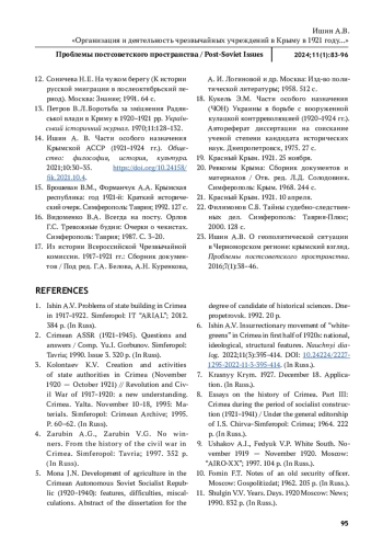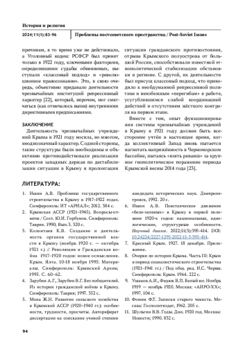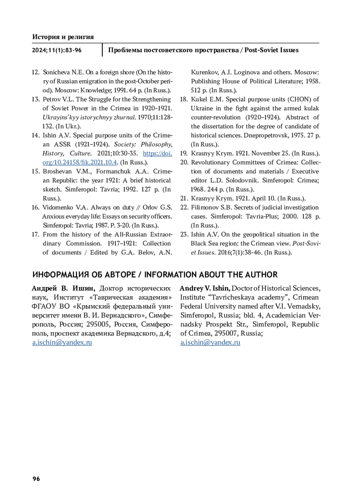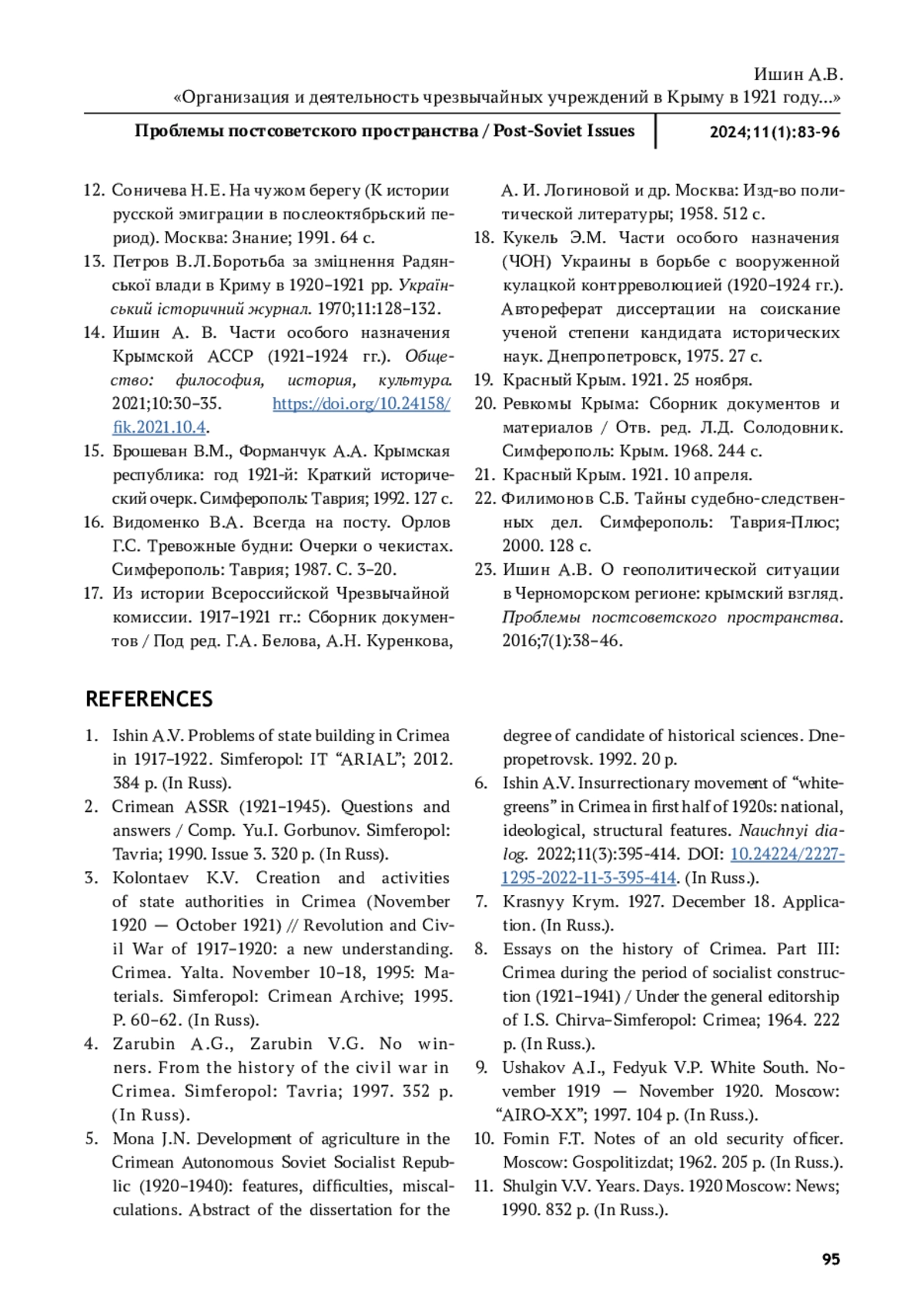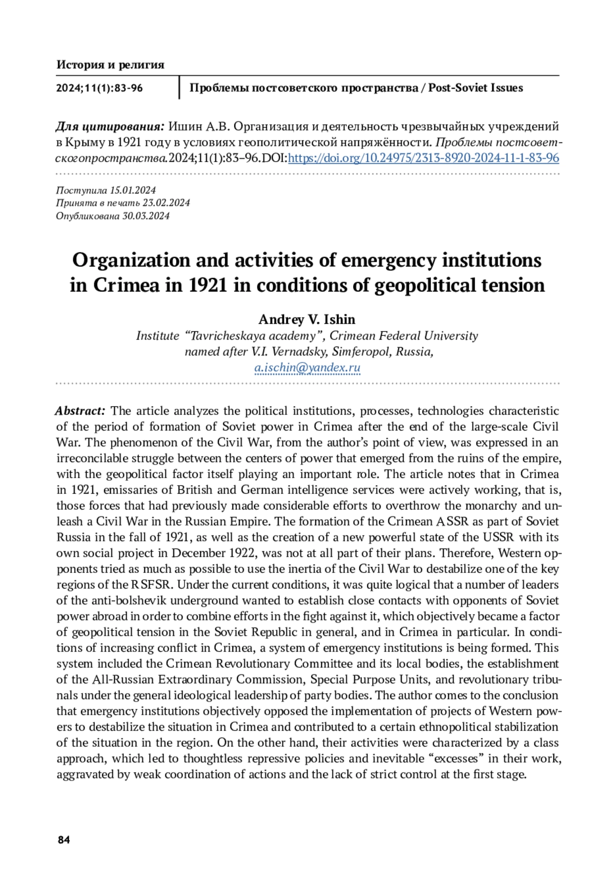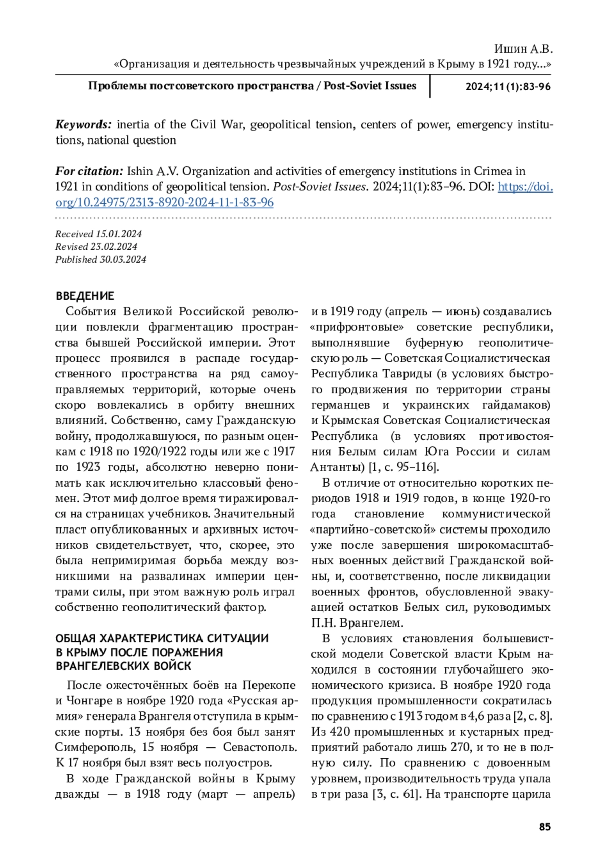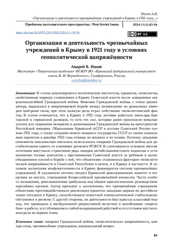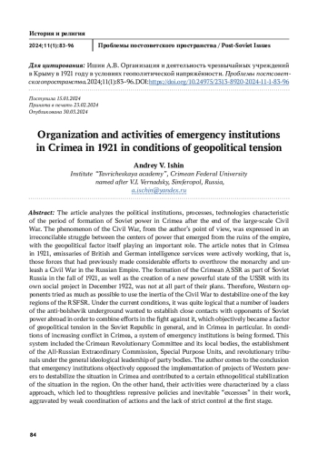 ИШИН А. В. ОРГАНИЗАЦИЯ И ДЕЯТЕЛЬНОСТЬ ЧРЕЗВЫЧАЙНЫХ УЧРЕЖДЕНИЙ В КРЫМУ В 1921 ГОДУ В УСЛОВИЯХ ГЕОПОЛИТИЧЕСКОЙ НАПРЯЖЁННОСТИ // ПРОБЛЕМЫ ПОСТСОВЕТСКОГО ПРОСТРАНСТВА. 2025. ТОМ 11, № 1