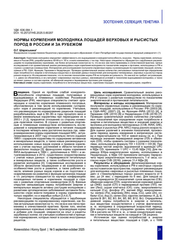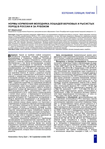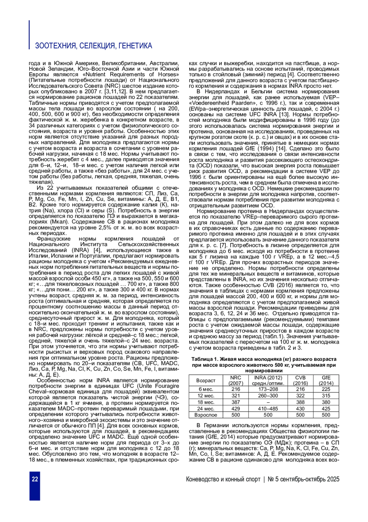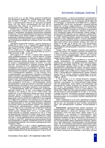 Одной из проблем слабой конкуренто- способности спортивных лошадей, получаемых и выращиваемых в племенных хозяйствах Российской Федерации (РФ), некоторые специалисты считают организацию и качество кормления племенного поголовья, обусловленную в том числе использованием «устарев- ших» норм и рекомендаций по кормлению. Учитывая, что рекомендации по нормированию рационов лошадей разрабатывались ещё в 60-80-е годы прошлого века и имели минимальные коррективы при переиздании их в 2003 г. [1,2], предвзятое отношение со стороны конево- дов-практиков понятно.