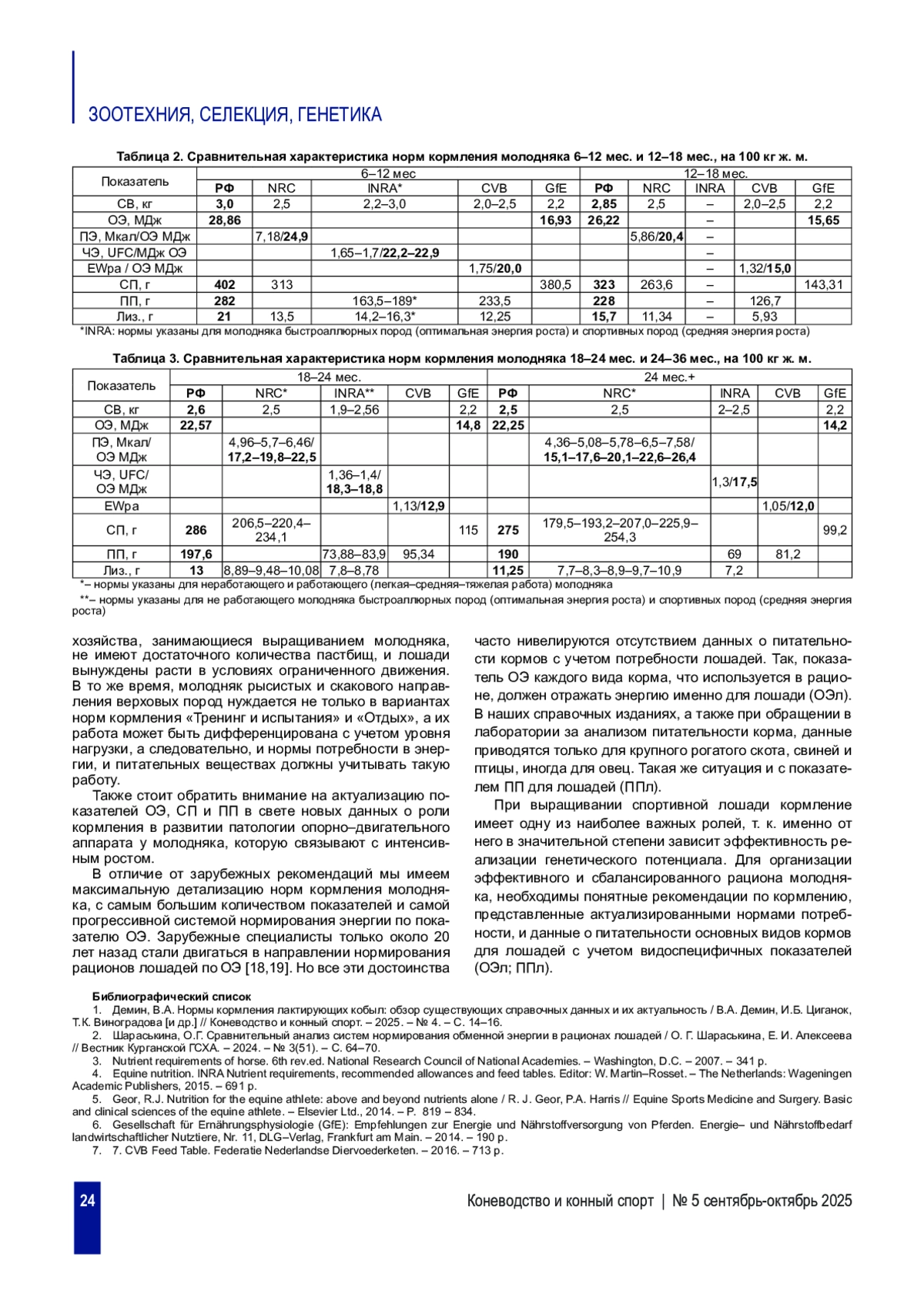 1. Демин, В.А. Нормы кормления лактирующих кобыл: обзор существующих справочных данных и их актуальность / В.А. Демин, И.Б. Циганок, Т.К. Виноградова [и др.] // Коневодство и конный спорт. - 2025. - № 4. - С. 14-16.