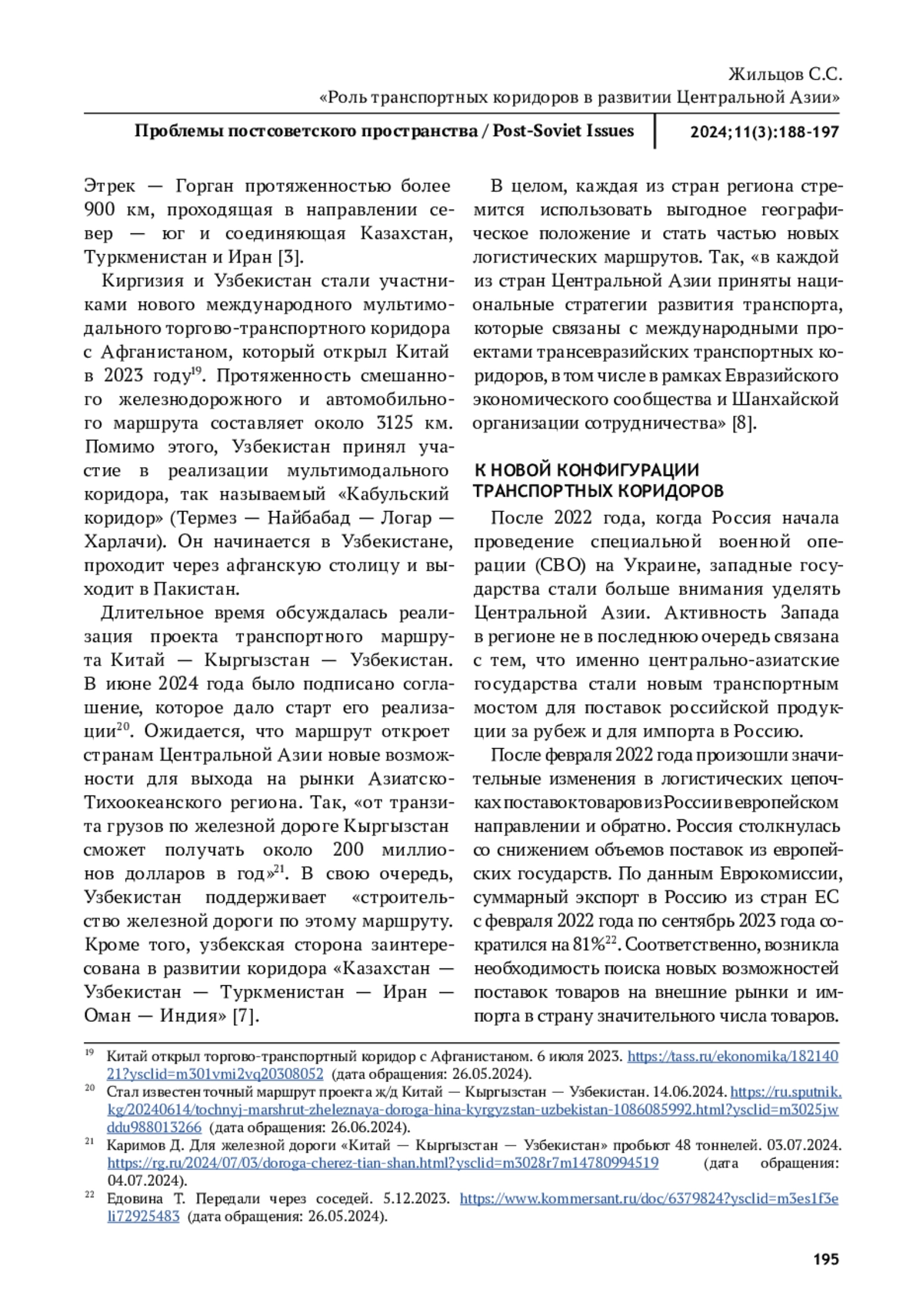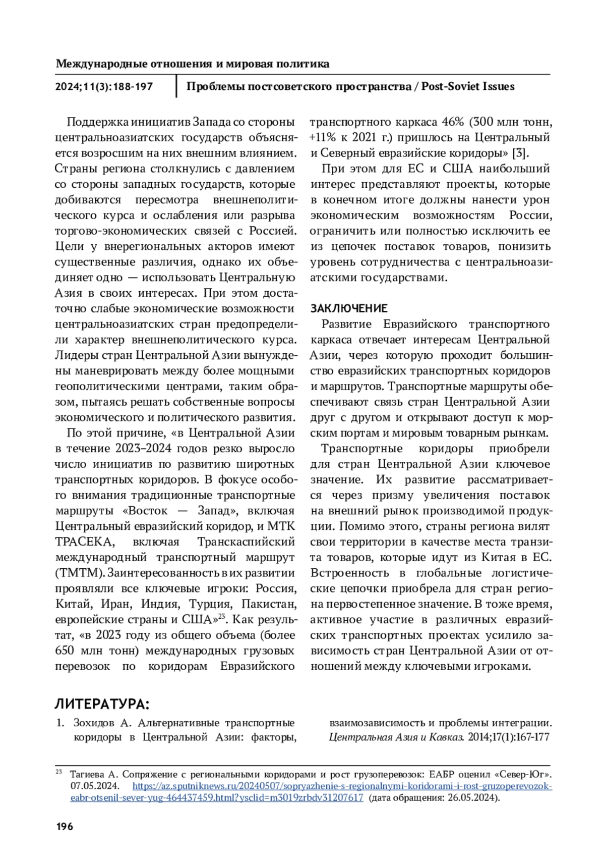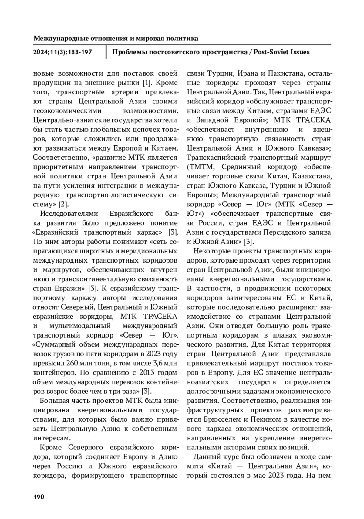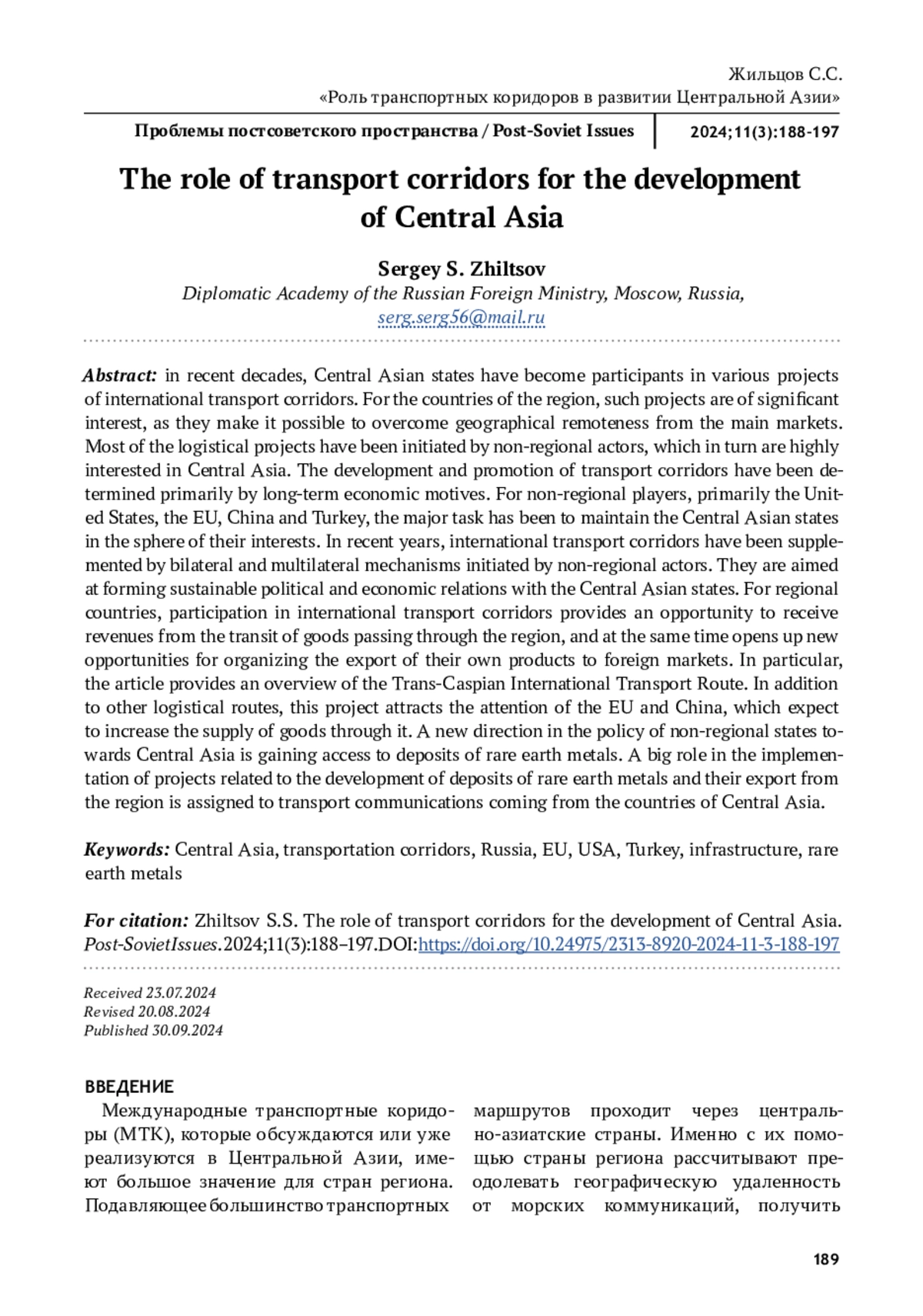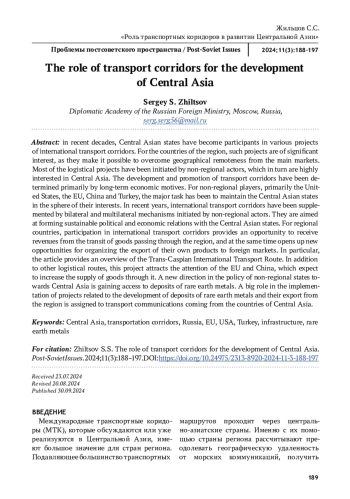 В последние десятилетия страны Центральной Азии стали участниками разных проектов международных транспортных коридоров. Для стран региона эти проекты представляют значительный интерес, поскольку позволяют преодолеть географическую удаленность от основных рынков сбыта. Большая часть транспортных проектов была инициирована внерегиональными акторами, которые в свою очередь, проявляют к Центральной Азии повышенный интерес. Разработка и продвижение проектов транспортных коридоров определялись, прежде всего, долгосрочными экономическими интересами. Для внерегиональных государств, прежде всего, США, ЕС, Китая, Турции, приоритетной задачей являлось закрепление государств Центральной Азии в сфере своих интересов. В последние годы транспортные международные коридоры были дополнены двусторонними и многосторонними механизмами, которые инициировали внерегиональные акторы. Они направлены на формирование устойчивых политических и экономических отношений с центрально-азиатскими государствами. Для стран Центральной Азии участие в международных транспортных коридорах дает возможность получать доходы от транзита грузов, идущих через территорию региона, и одновременно открывает новые возможности для организации поставок собственной продукции на внешние рынки. В частности, большое внимание уделяется проекту Транскаспийского международного транспортного маршрута. Помимо других транспортных маршрутов, этот проект привлекает внимание ЕС и Китая, которые рассчитывают увеличить по нему поставки товаров. Новым направлением политики внерегиональных государств в отношении Центральной Азии является получение доступа к месторождениям редкоземельных металлов. Большая роль в реализации проектов, связанных с разработкой месторождений редкоземельных металлов и его вывозом из региона отводится транспортным коммуникациям, идущим из стран Центральной Азии.