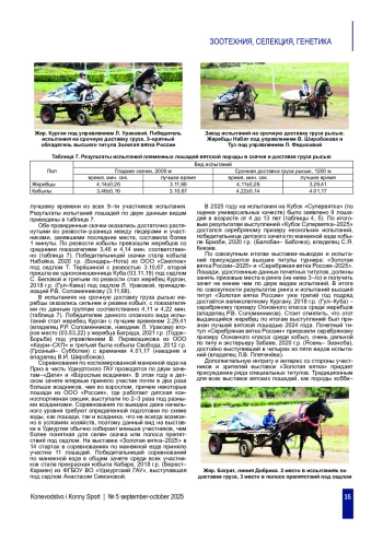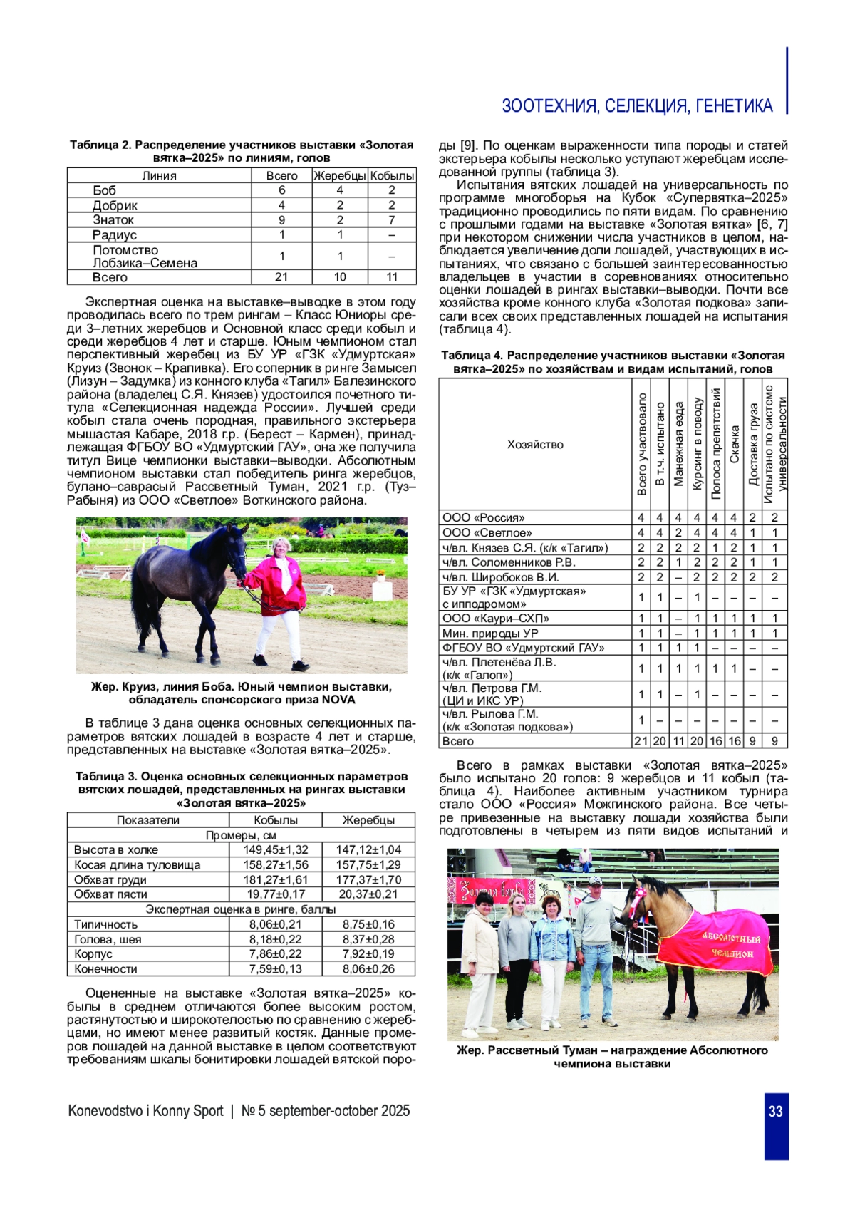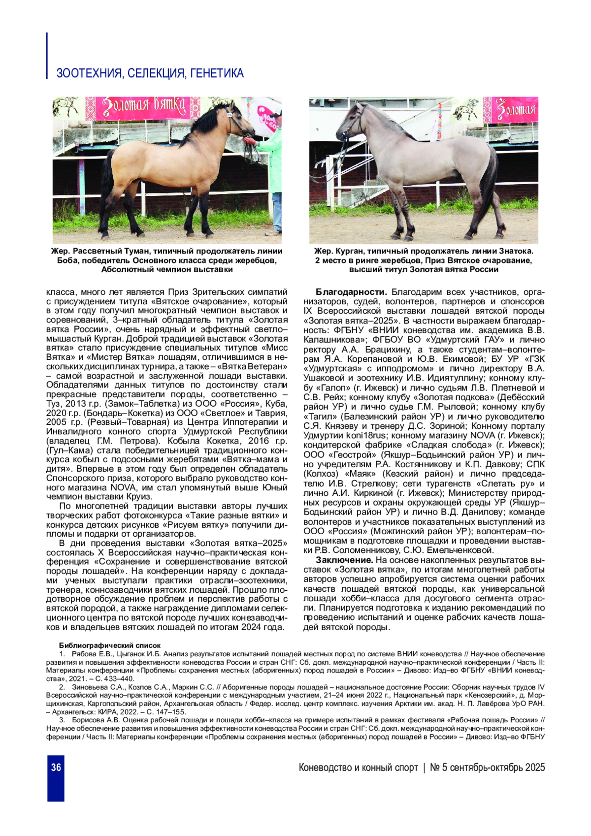 8. Белоусова Н.Ф., Басс С.П. Современное состояние вятской породы лошадей, проблемы и перспективы работы с племенным фондом // Коневодство и конный спорт. - 2025. - № 2. - С. 34-40.