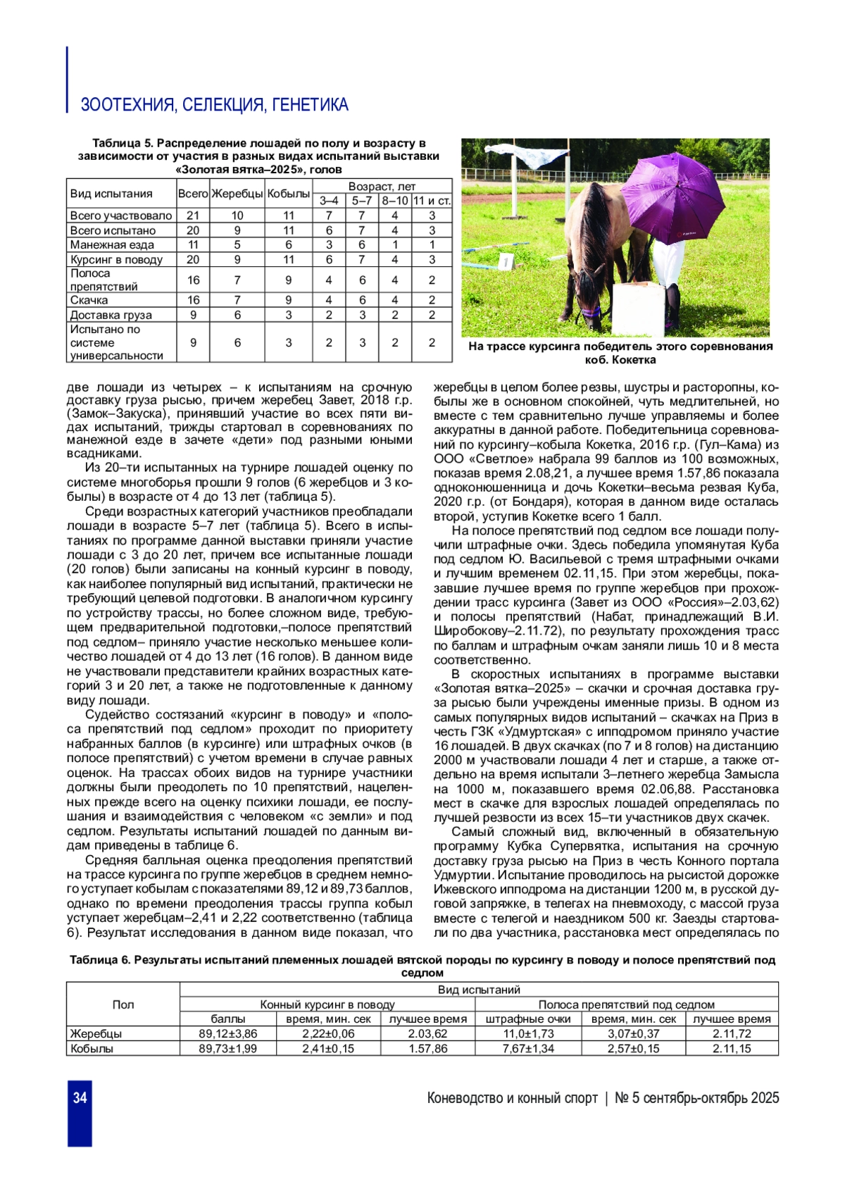 6. Белоусова Н.Ф., Басс С.П., Зиновьева С.А. Итоги VI межрегиональной выставки “Золотая вятка-2021”, как результат апробации методики испытаний работоспособности вятских лошадей // Коневодство и конный спорт. - 2021. - № 4. - С. 28-30.
