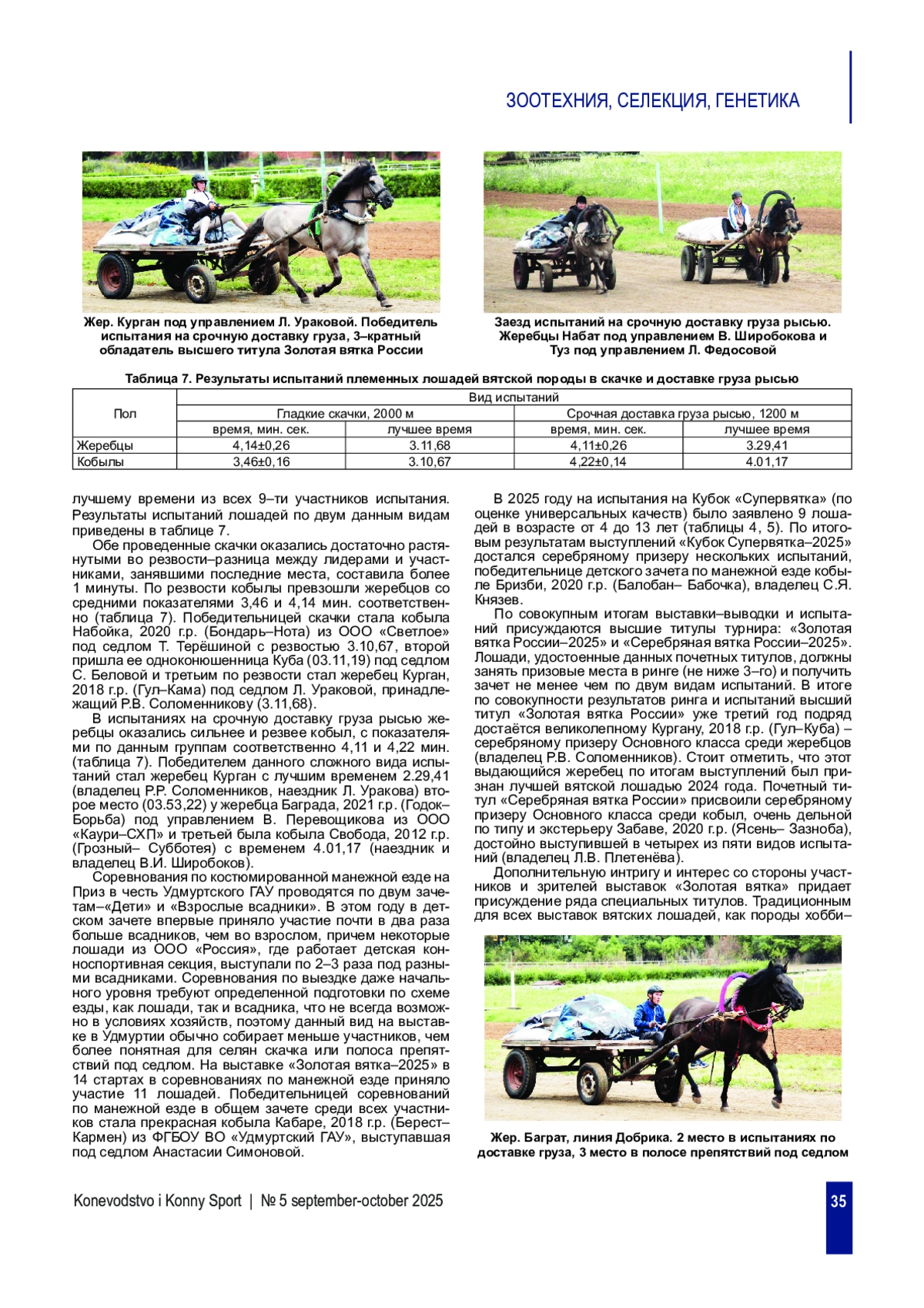 7. Журавлёва Ю.Д. Анализ результатов VII Всероссийской выставки лошадей вятской породы “Золотая вятка-2023” / Ю.Д. Журавлёва, Н.Ф. Белоусова, С.П. Басс, С.А. Зиновьева // Коневодство и конный спорт. - 2023. - № 4. - С. 22-24.