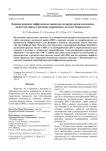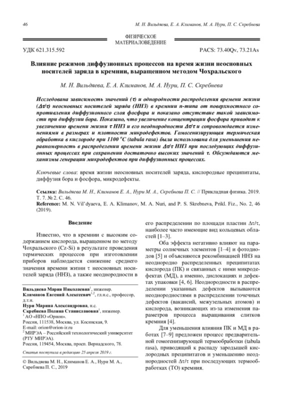 Вильдяева М. Н., Климанов Е. А., Нури М. А., Скребнева П. С. Влияние режимов диффузионных процессов на время жизни неосновных носителей за-ряда в кремнии, выращенном методом Чохральского 46