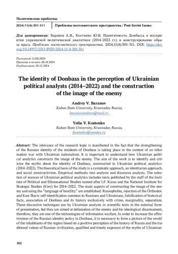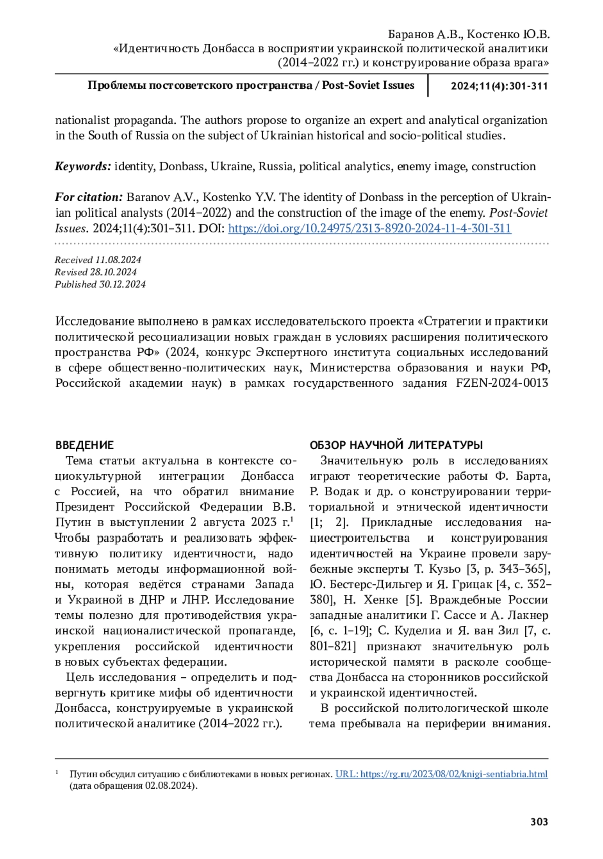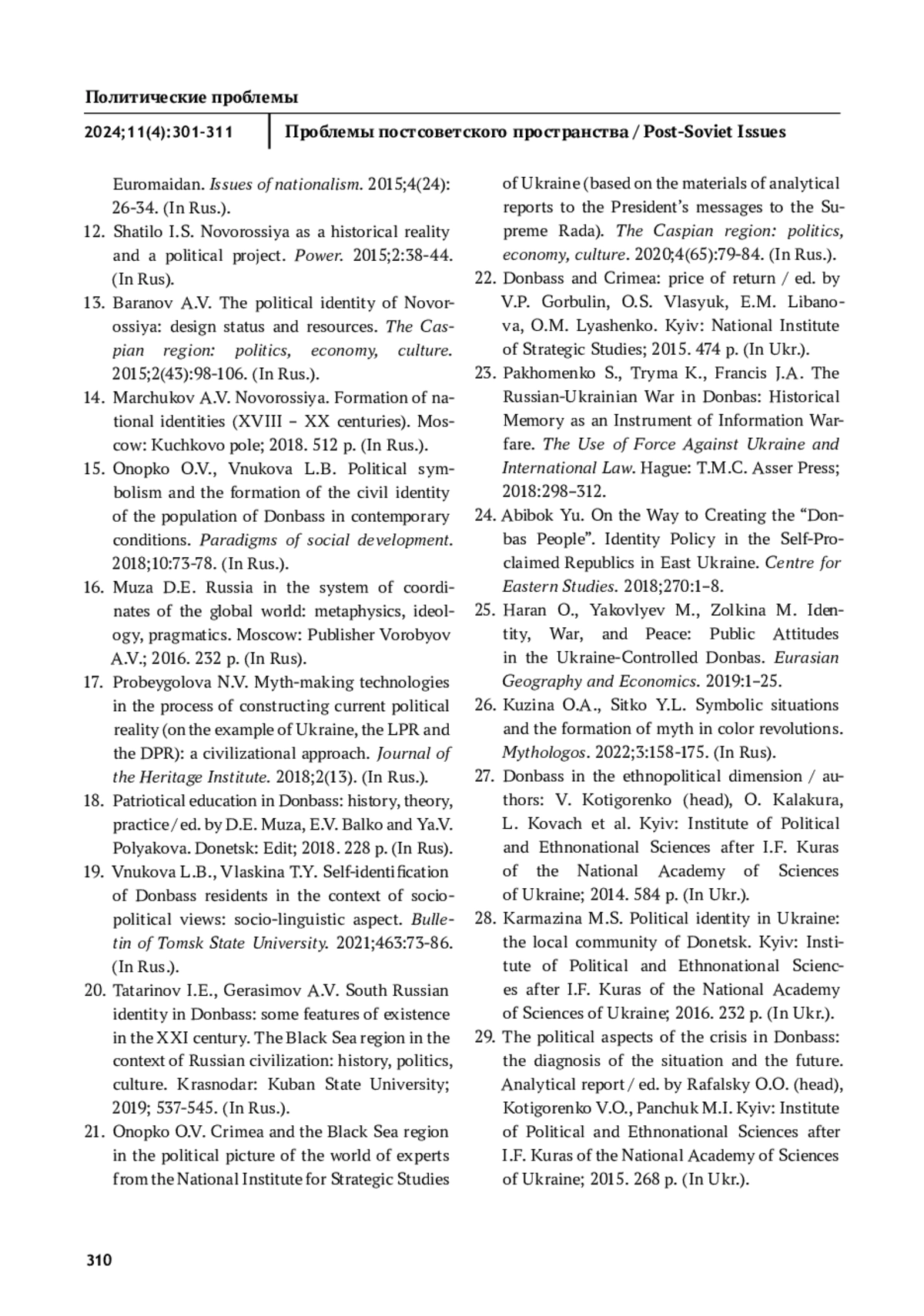 13. Баранов А.В. Политическая идентичность Новороссии: состояние и ресурсы конструирования. Каспийский регион: политика, экономика, культура. 2015;2(43):98-106.