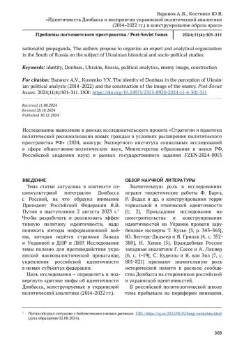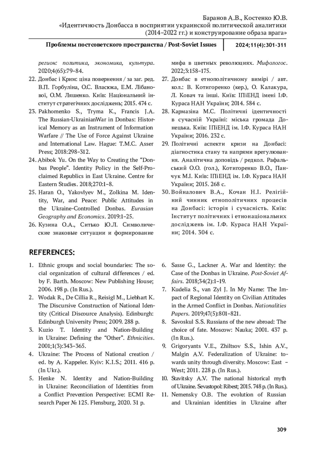 25. Haran O., Yakovlyev M., Zolkina M. Identity, War, and Peace: Public Attitudes in the Ukraine-Сontrolled Donbas. Eurasian Geography and Economics. 2019:1-25.