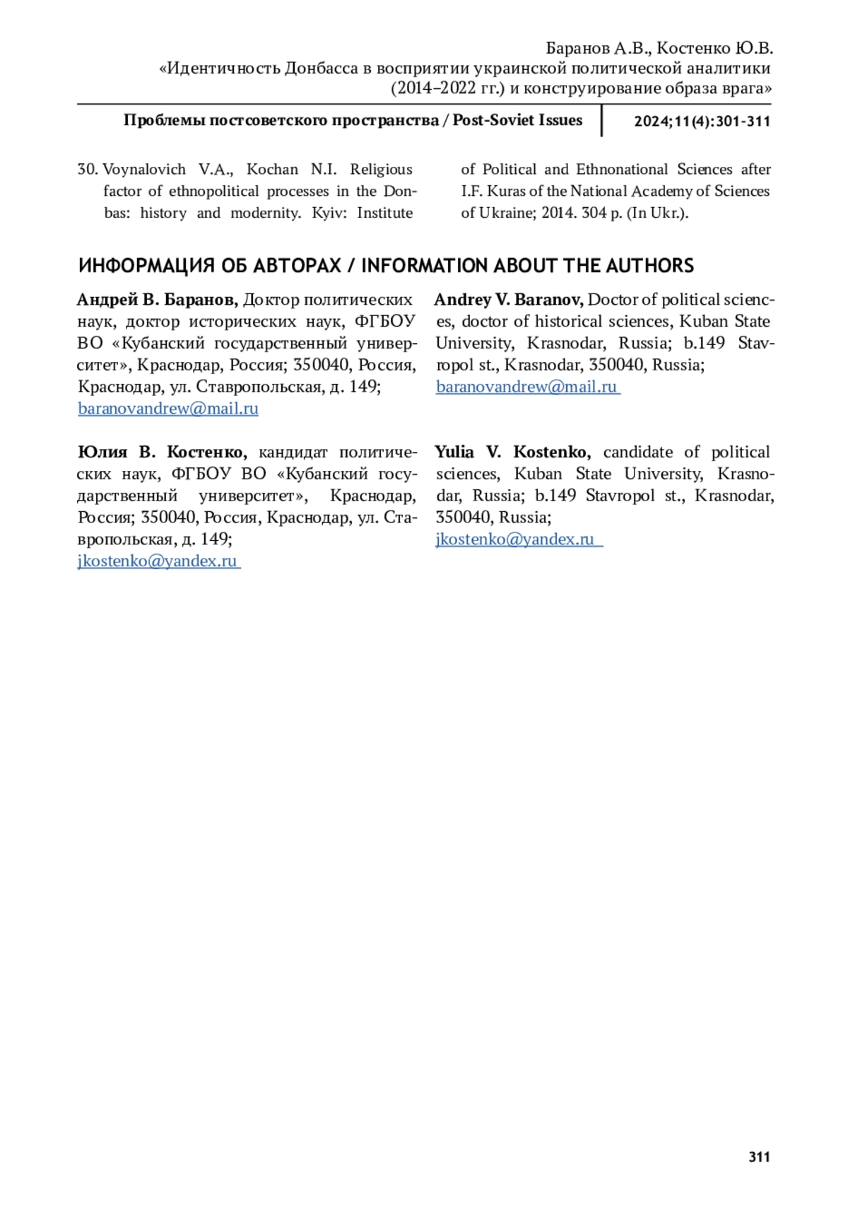 30. Войналович В.А., Кочан Н.І. Релігійний чинник етнополітичних процесів на Донбасі: історія і сучасність. Київ: Інститут політичних і етнонаціональних досліджень ім. І.Ф. Кураса НАН України; 2014. 304 с.