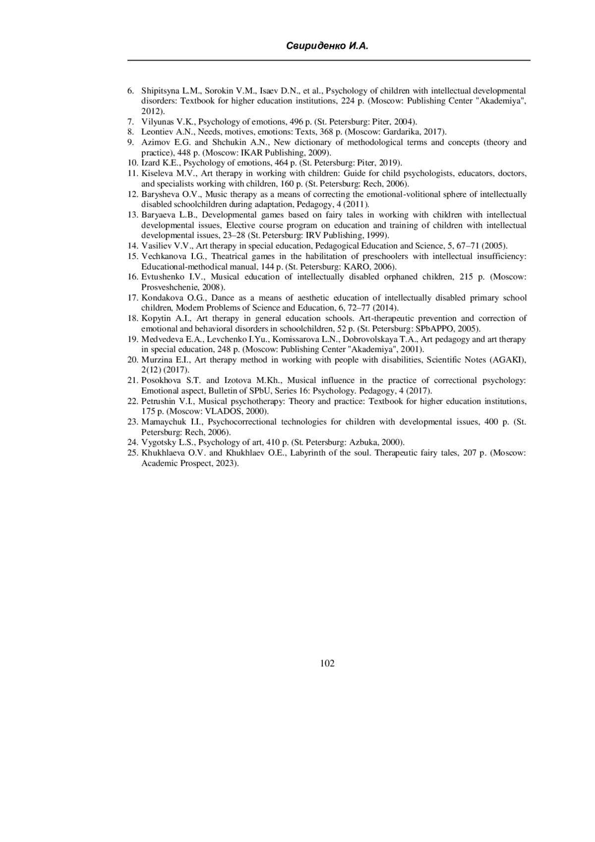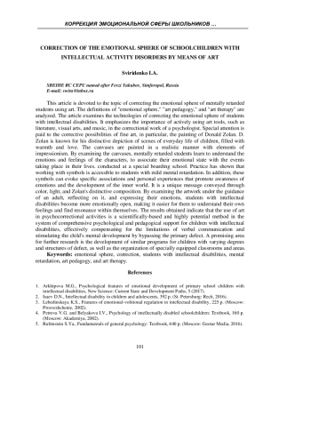 СВИРИДЕНКО И. А. КОРРЕКЦИЯ ЭМОЦИОНАЛЬНОЙ СФЕРЫ ШКОЛЬНИКОВ С НРУШЕНИЕМ ИНТЕЛЛЕКТУАЛЬНОЙ ДЕЯТЕЛЬНОСТИ СРЕДСТВАМИ ИСКУССТВА // УЧЕНЫЕ ЗАПИСКИ КРЫМСКОГО ФЕДЕРАЛЬНОГО УНИВЕРСИТЕТА ИМЕНИ В. И. ВЕРНАДСКОГО. СОЦИОЛОГИЯ. ПЕДАГОГИКА. ПСИХОЛОГИЯ. 2025. ТОМ 11 (77). № 3