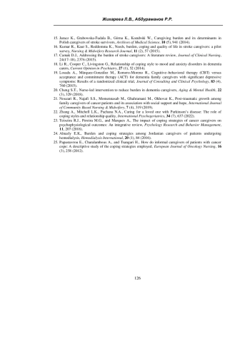16. Kumar R. Needs, burden, coping and quality of life in stroke caregivers: a pilot survey / R. Kumar, S. Kaur, K. Reddemma // Nurs. & Midwifery Res. J. - 2015. - Vol. 11, № 2. - P. 57-67.