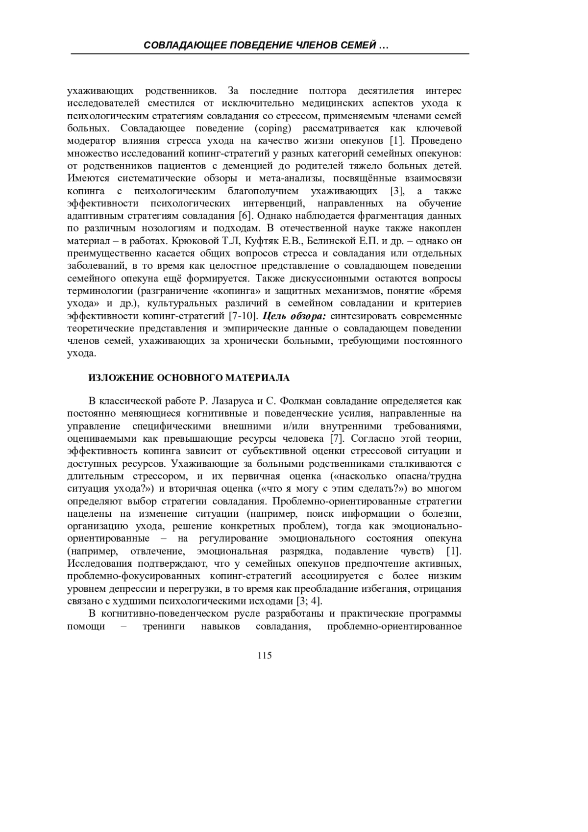 Статья представляет теоретический обзор современных исследований, посвящённых совладающему поведению членов семей, ухаживающих за близкими с хроническими заболеваниями, требующими постоянного ухода (инсульт, деменция, онкология и др.). Рассматриваются ключевые подходы к копингу: когнитивно-поведенческий, стресс-ориентированный и системно-семейный. Проанализированы типичные стратегии совладания у семейных опекунов, их связь с психологическим благополучием, а также факторы, влияющие на выбор копинга: характер заболевания, культура, социальная поддержка и личностные ресурсы. Отмечено, что проблемно-ориентированные и социально направленные стратегии связаны с более низким уровнем дистресса, тогда как избегание и отрицание - с эмоциональным выгоранием и депрессией. Рассматриваются методы психологической помощи ухаживающим: тренинги копинга, семейное консультирование, когнитивно-поведенческая терапия. Обзор опирается на русскоязычные и зарубежные источники последних 15 лет.